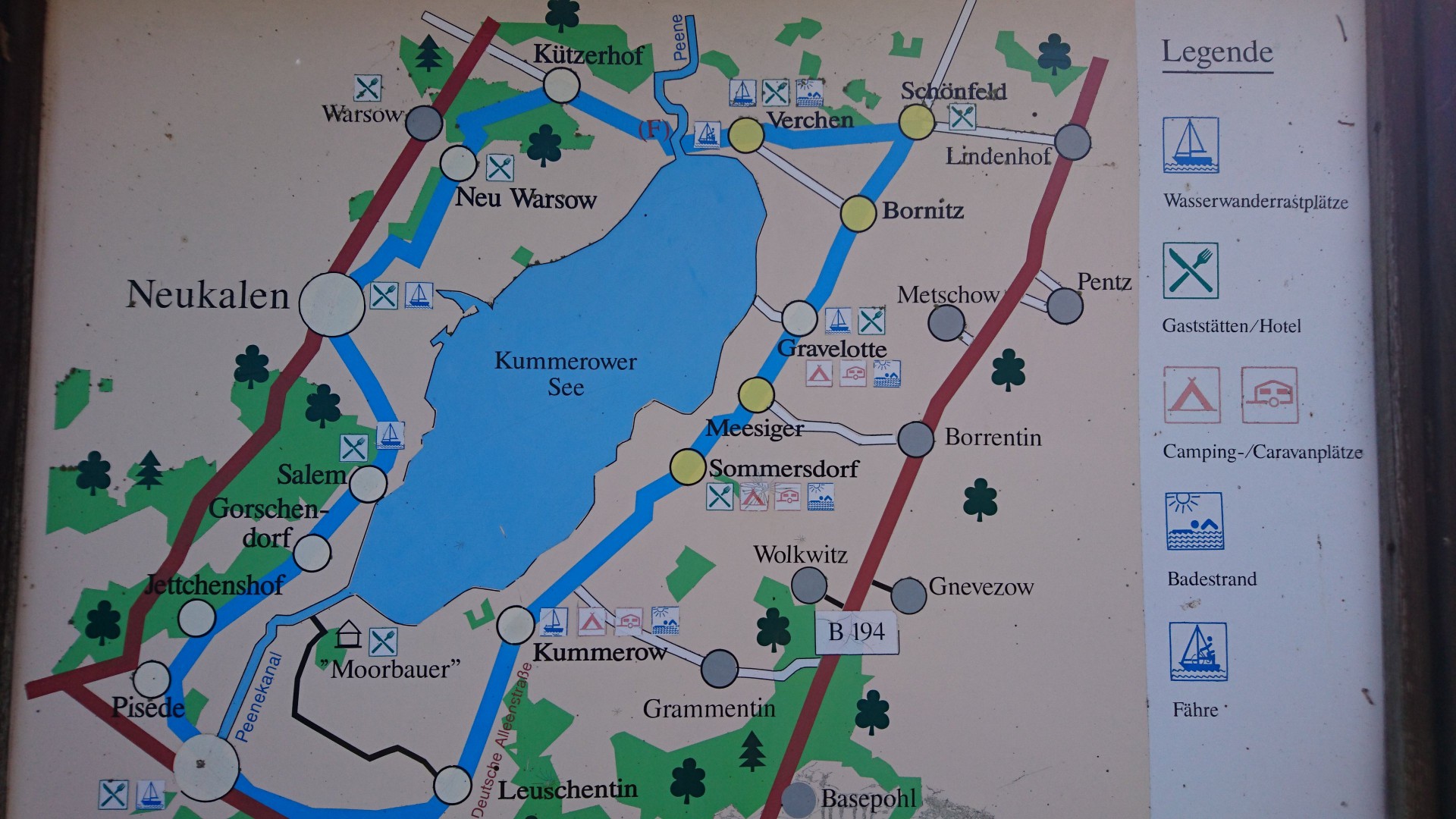 Der See ist elf Kilometer lang, der Radweg um ihn herum etwa 35 Kilometer lang. Das Schiff fährt täglich außer montags. Samstags sind Charterfahrten, zu Himmelfahrt war es schon sehr gut gebucht, erklärte Wolf Dieter Schott als Sprecher der Blau-Weißen Flotte. „Das scheint ein lustiges Völkchen zu sein.“ Schott rechnet mit zwei bis drei Jahren Anlaufzeit für den Linienverkehr im Saisonbetrieb. Kummerow liegt rund 30 Kilometer nördlich von Waren an der Deutschen Alleenstraße: Wer den Hafen sucht, kann auch Richtung Schloss fahren.