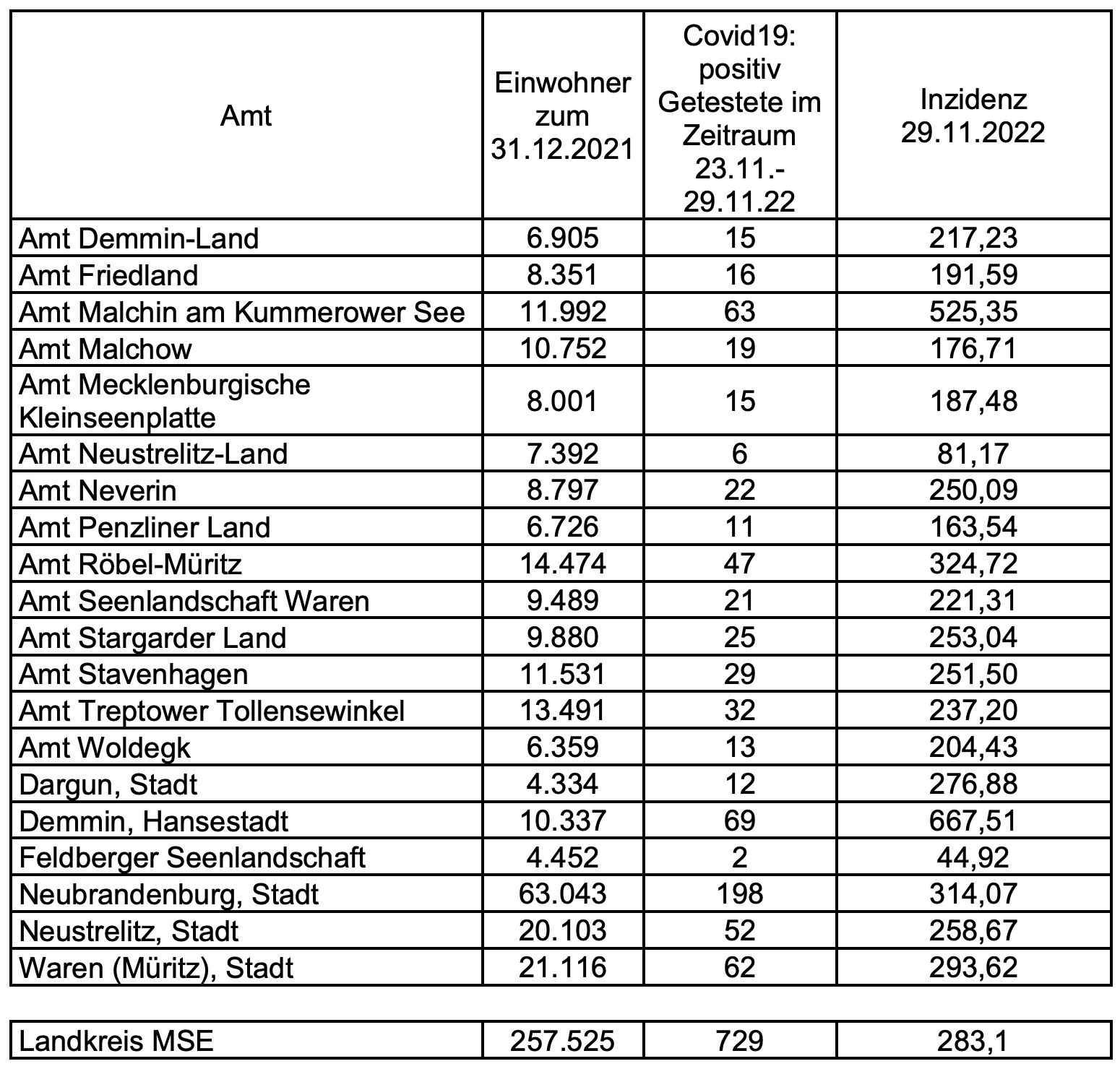 Und hier die aktuellen Corona-Inzidenzen des Landkreises Mecklenburgische Seenplatte – aufgeschlüsselt nach Städten und Ämtern – im Überblick: