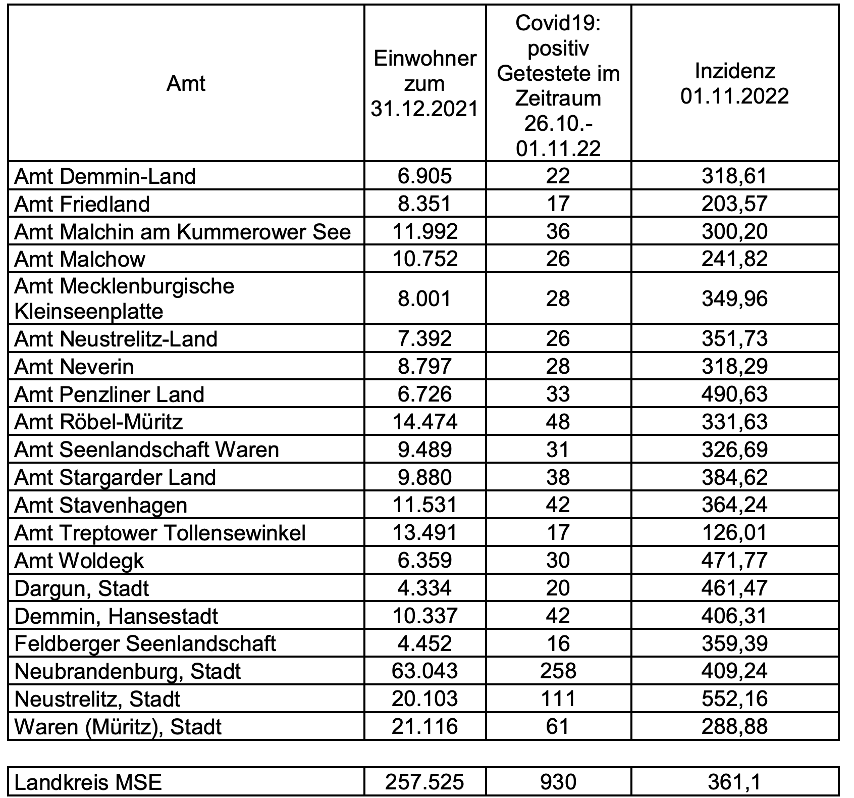 Und hier die aktuellen Corona-Inzidenzen des Landkreises Mecklenburgische Seenplatte – aufgeschlüsselt nach Städten und Ämtern – im Überblick: