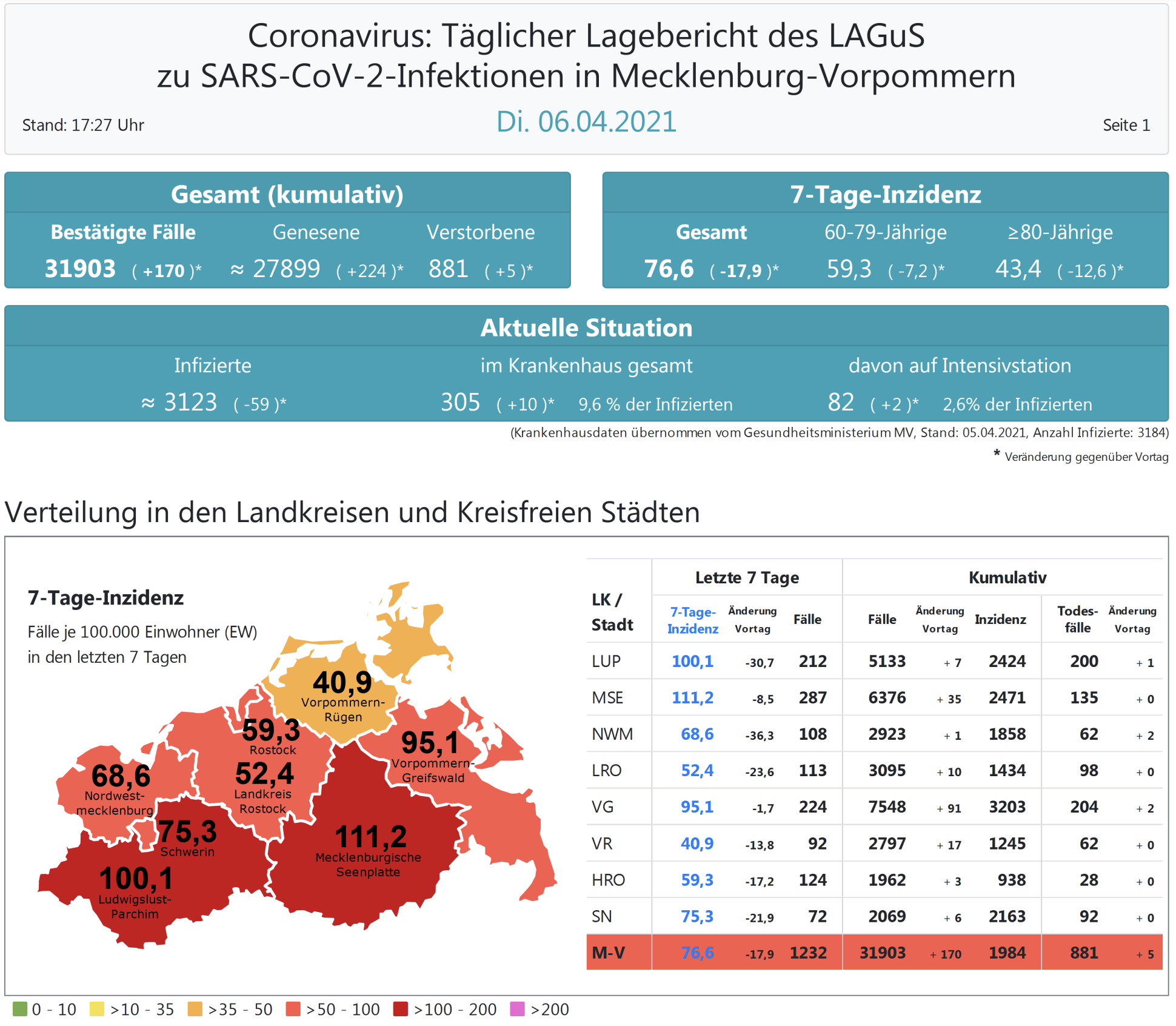 Der Inzidenzwert für ganz Mecklenburg-Vorpommern ist deutlich gesunken und liegt heute bei 76,6 (gestern 94,5). Insgesamt meldet das Land Mecklenburg-Vorpommern heute 170 Neuinfektionen.