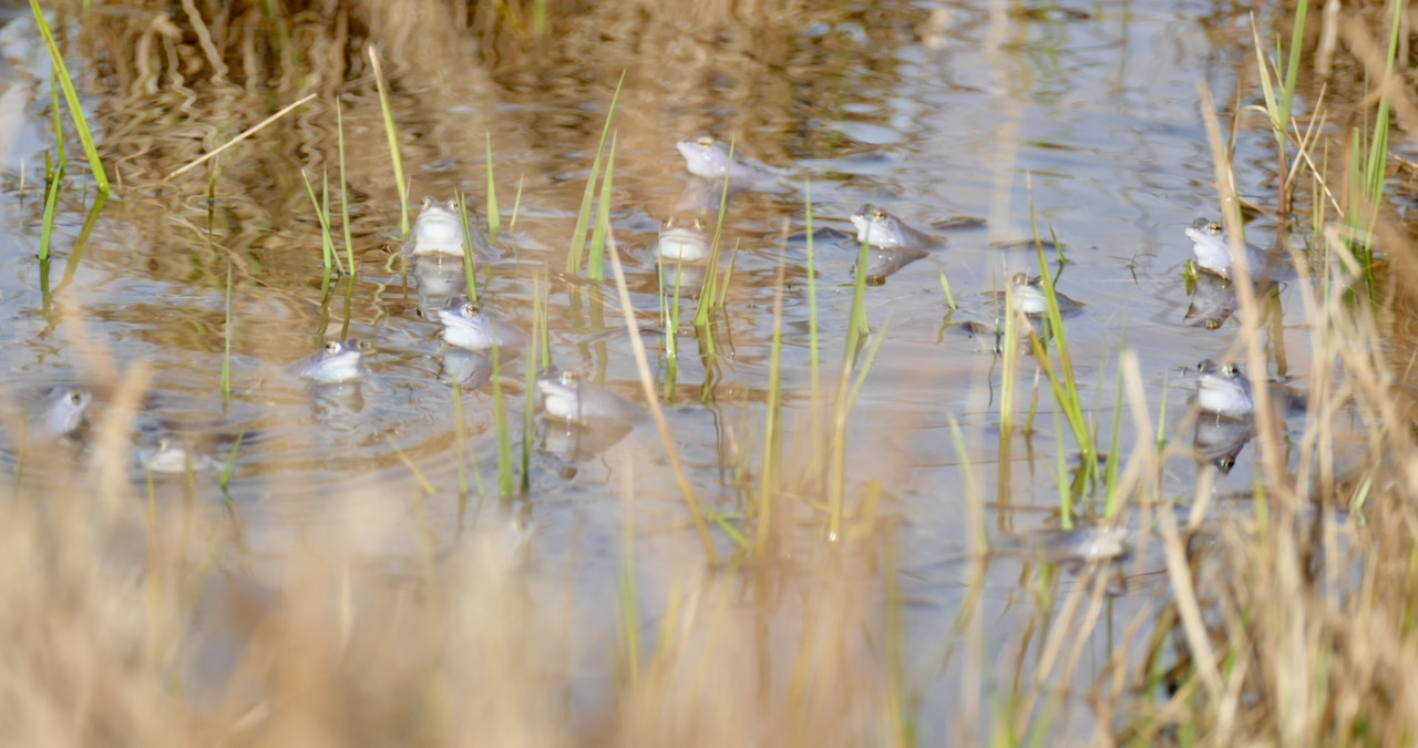 Wie jedes Jahr treffen sich an den Kleingewässern mehrere tausend Solisten und Darsteller im zeitigen Frühjahr. In der Paarungszeit der Lurche finden mehrere Events statt, die sehr viel Energie und ein starkes Durchhaltevermögen verlangen. Der krönende Abschluss ist die Paarung – und damit die Eiablage. Das erste große Festival ist gerade am Ausklingen: Zum Ende des Winters, wenn es am Tag ausreichend warm wird, kommen Grasfrosch und Moorfrosch als erstes in die Gewässer. Im vergangenen Jahr waren die blauen Frösche in der Zeit um Ostern zu hören, die aktuell warmen Temperaturen beschleunigen das Spektakel.