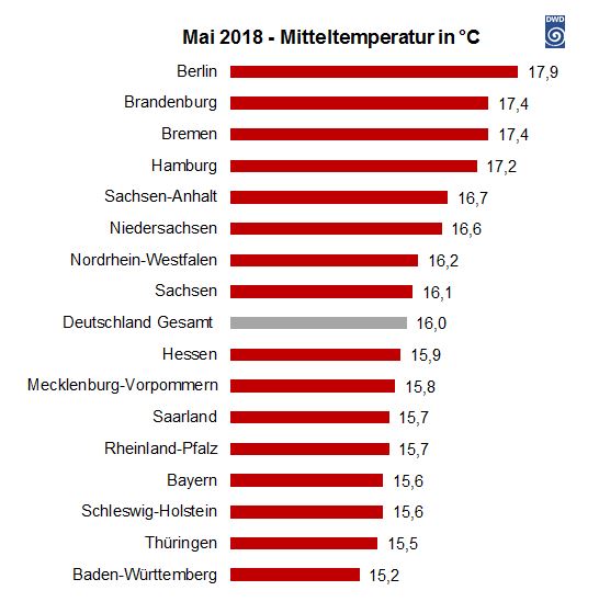 Mit rund 16,0 Grad Celsius (°C) lag der Temperaturdurchschnitt um etwa 3,9 Grad über dem Wert der international gültigen Referenzperiode 1961 bis 1990. Auch gegenüber der Vergleichsperiode 1981 bis 2010 betrug die Abweichung nach oben noch rund 3 Grad. Damit war der Mai ähnlich warm wie der Mai des Jahres 1889, dem bisherigen Rekordhalter.