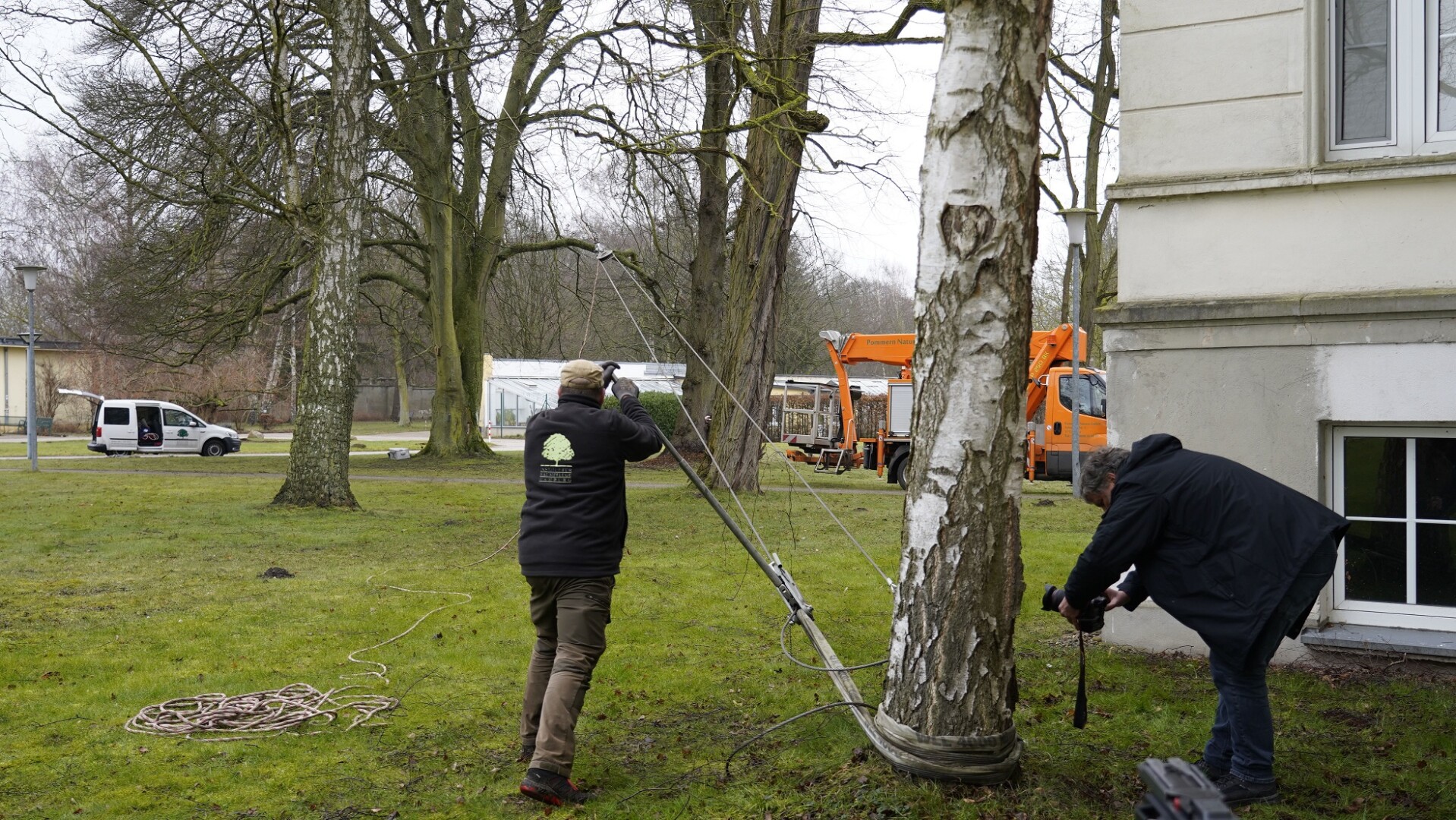 Bild: Bei einer etwa 150 Jahre alten Buche wurde am Freitag ein seltener Zugversuch durchgeführt, um ihre Standsicherheit zu überprüfen.