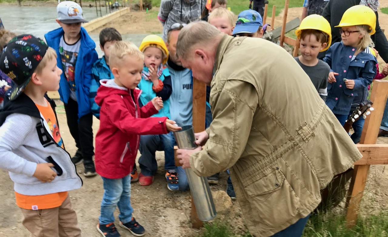 15 Knirpse der Kita „Seute Plappersnuten“ durften vor wenigen Tagen bei der Grundsteinlegung für ihre neue Kindertagesstätte in Sietow dabei sein. Bürgermeister Frank Etzold hatte eine Schatulle mitgebracht, die mit kleinen und größeren bemalten Steinen und einem Brief gefüllt wurde. „Ich hab auch noch etwas, Herr Bürgermeister“, riefen die Kinder ganz aufgeregt.