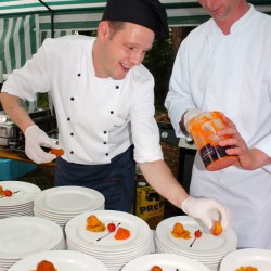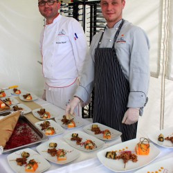 Christian Braun, Chefkoch in der „Villa Margarete“, empfing die Schlemmerfreunde an der Olympianlage mit einer „Praline vom Jungschwein aus dem Smoker“ Auch dieses lauschige Plätzchen erwies sich als goldrichtig für die Kulinale, auch wenn dem einen oder anderen vorbeilaufenden Jogger bei diesen Düften sicherlich das Wasser im Mund zusammengelaufen ist.