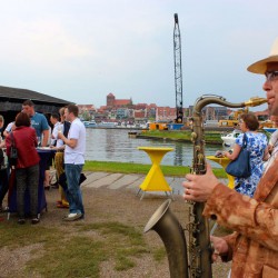Los ging’s am Kietz mit einer herzlichen Begrüßung durch die Organisatoren des Rotary-Clubs um Präsident Bernd Gehrmann. Jeder Genuss-Spaziergänger bekam sein eigenes Weinglas mit dem eingravierten Schriftzug „Warener Kulinale“ und auch gleich den ersten edlen Tropfen. Außerdem eine Karte, die an jeder Station gelocht wurde. Riccardo Musolf und sein Müritz-Catering-Team legten die Latte mit „Mille feuille vom heimischen Gemüse an sautierten Pfifferlingen“ gleich richtig hoch. Ein delikater Start.
