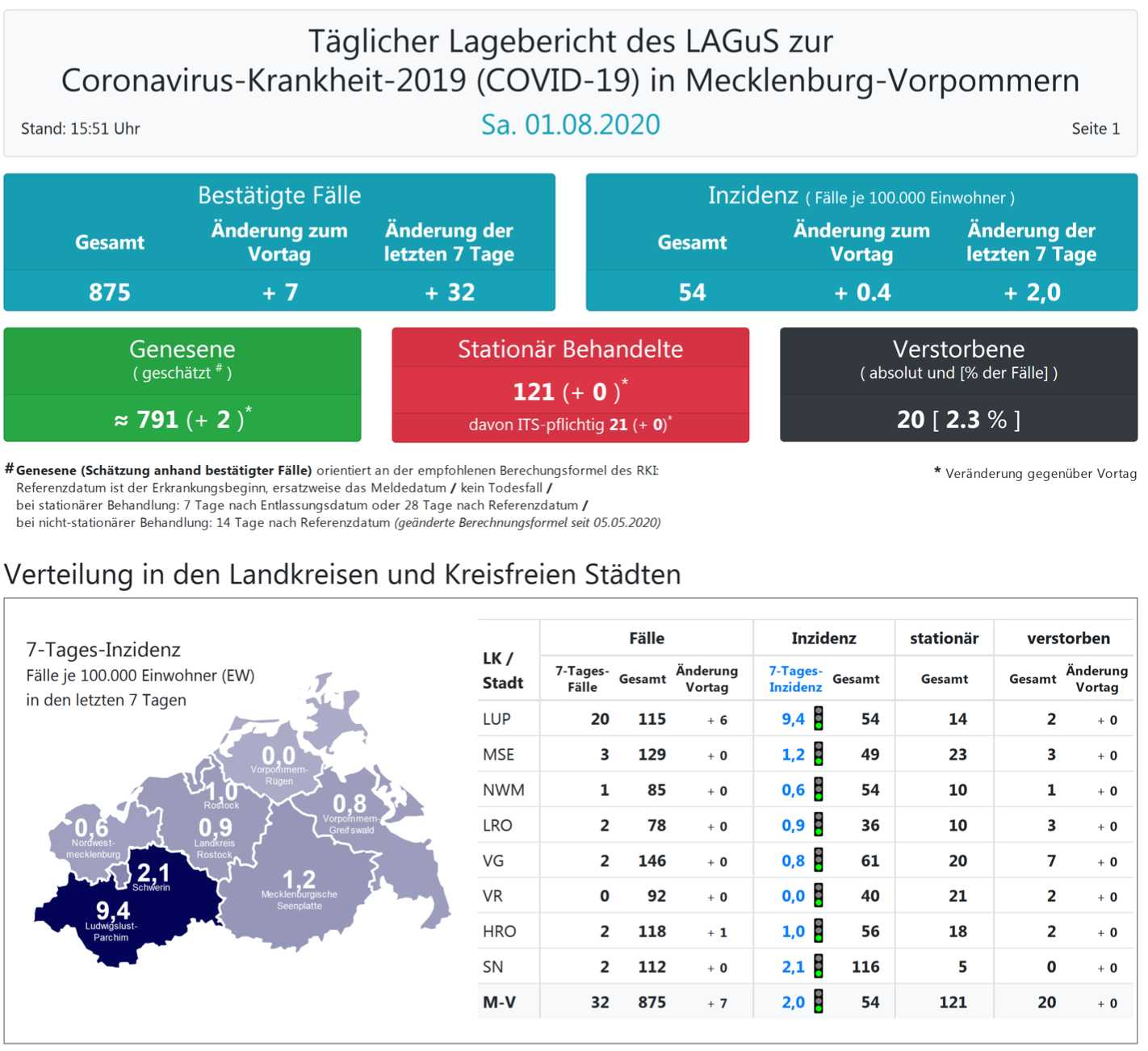 Laut einer Schätzung des Robert Koch-Instituts (RKI) sind in Mecklenburg-Vorpommern 791 Personen der positiv getesteten Menschen von einer Covid-19-Erkrankung genesen. Insgesamt gab es bislang 20 Todesfälle im Land. Landesweit müssen oder mussten den Angaben zufolge 121 Menschen in Kliniken behandelt werden – 21 von ihnen auf Intensivstationen.