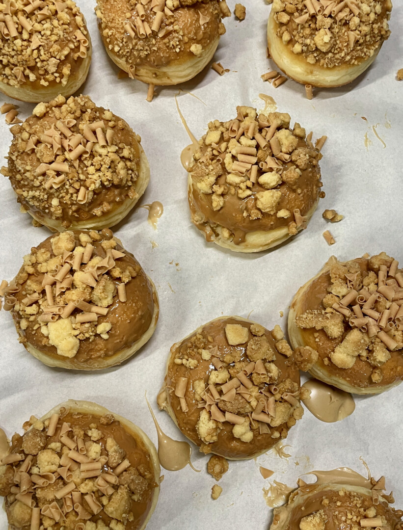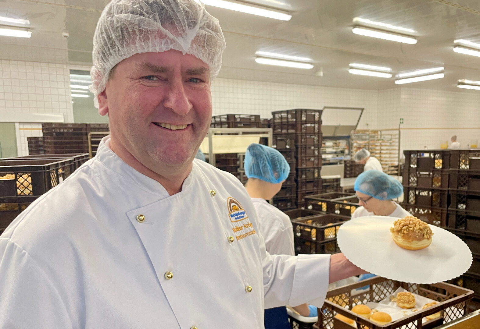 „Wir lassen uns ja jedes Jahr etwas Neues einfallen, und unsere Johanna hat dieses Mal den ‚Nocciolata bianca‘ gezaubert“, berichtet Völker Kröger. Mit Johanna meint er Konditormeisterin Johanna Rohde, die schon einmal den Landeswettbewerb der Konditoren gewonnen und beim Bundeswettbewerb mit einem vierten Platz hervorragend abgeschnitten hat. Heute ist die 24-Jährige Abteilungsleiterin und bildet sogar aus. Oder kreiert besondere Stücke, wie eben den „Italien-Berliner“.
