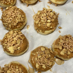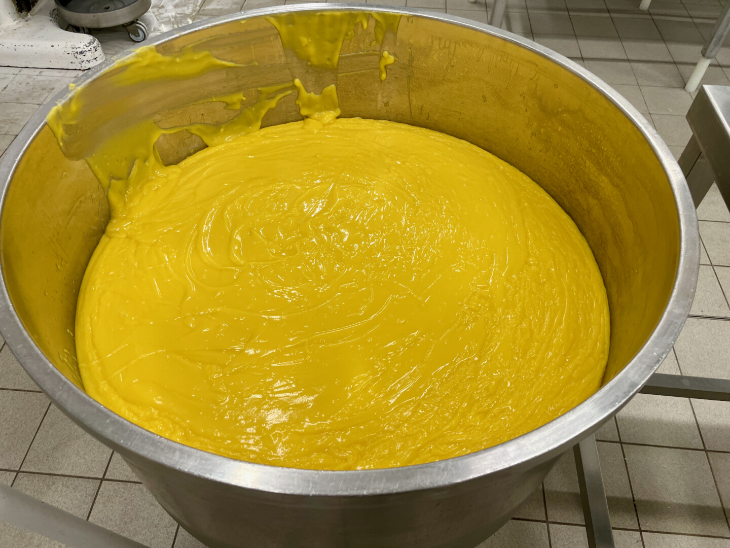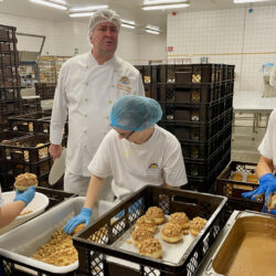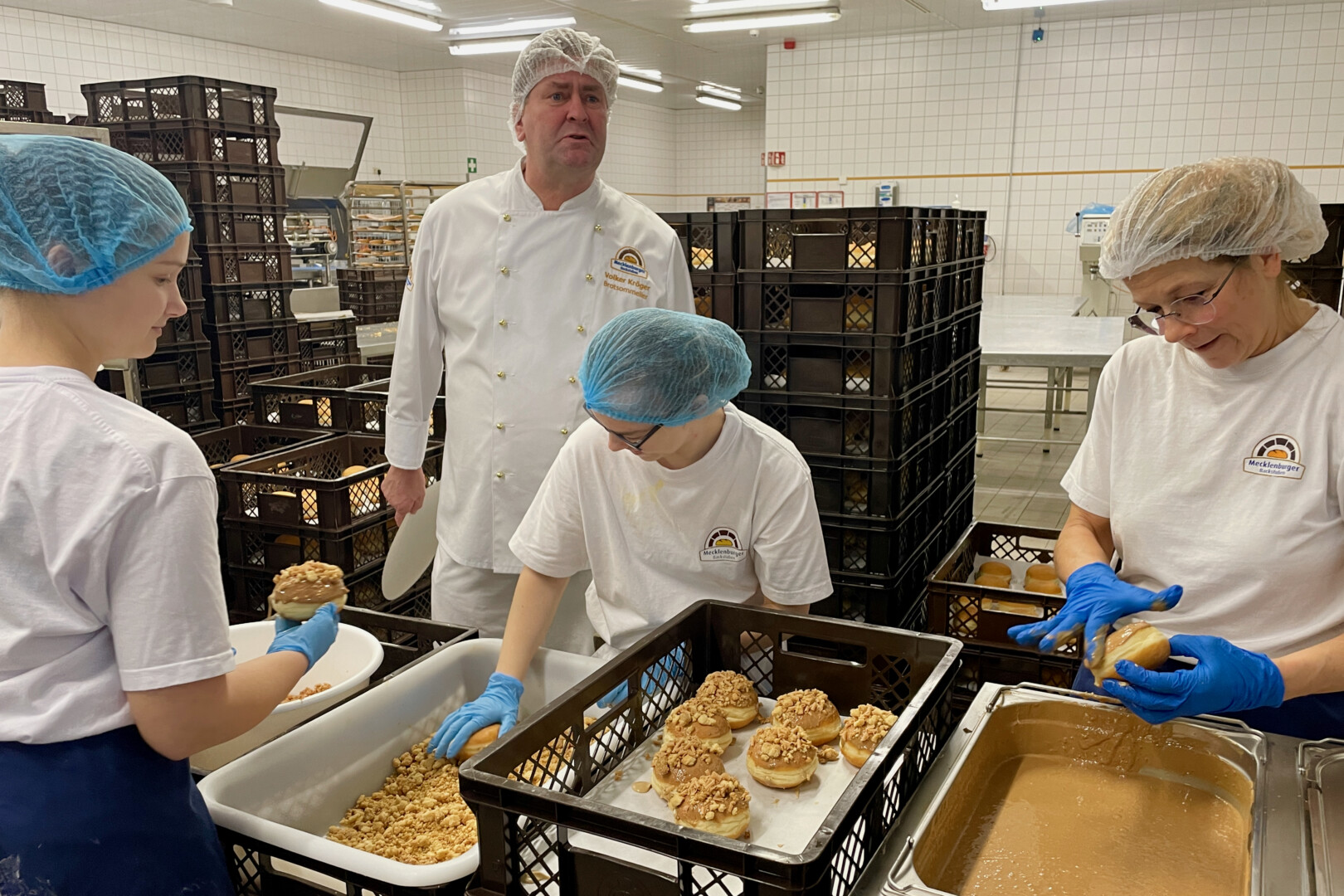 Neben dem Brombeer-Holunder-Berliner, gibt’s den Pfannkuchen auch mit Eierlikör, als „Pünktchen“ mit Smarties, in der Variation „Erdbeer Marc de Champagne, mit Pfirsich-Marjacura und Pflaumenmus sowie in diesem Jahr erstmal den „Nocciolata bianca“. Das, so erklärt Produktentwicker Völker Kröger, ist ein Berliner mit einer weißen Nougatmasse aus Mailand, Crumble und Schokoladensplittern. Alles in Handarbeit hergestellt.