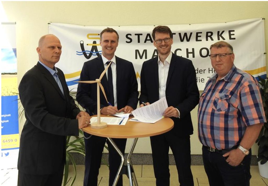 Der weitere Ausbau Erneuerbarer Energien ist entscheidend für wirtschaftliche Stabilität und die Erreichung der Klimaziele. Der Bau von Windparks oder Photovoltaik-Anlagen stößt aber nicht überall auf Akzeptanz. Grund ist auch, dass die betroffenen Gemeinden und die Menschen vor Ort bisher nur unzureichend an dem wirtschaftlichen Erfolg solcher Vorhaben beteiligt werden. Gemeinsam mit dem Unternehmen ENERTRAG wollen die Stadtwerke Malchow dies in der Gemeinde Bütow nun ändern. Hier plant die ENERTRAG das „Repowering“ eines bestehenden Windparks: 21 alte Windkraftanlagen sollen durch 8 neue, sehr viel leistungsstärkere, Anlagen ersetzt werden. Damit auch die Bürger in Bütow direkt von diesem Vorhaben profitieren können, unterzeichneten die ENERTRAG und die Stadtwerken Malchow unlängst einen gemeinsamen Vertrag zur Umsetzung eines sogenannten Windkraftbonus. Mit vor Ort waren auch die Bürgermeister aus Bütow sowie der Inselstadt Malchow.