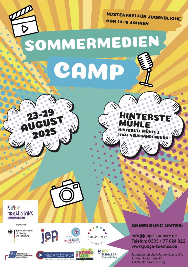 Vom 23. bis 29. August findet in der Hintersten Mühle in Neubrandenburg das Sommermediencamp 2025 statt. Für dieses Sommerferienangebot können sich jetzt junge Medieninteressierte und Medienbegeisterte anmelden. Beim diesjährigen Sommermediencamp erwartet Jugendliche zwischen 14 und 18 Jahren eine inspirierende und breite Angebotswoche an Workshops in den Bereichen Film, Hip-Hop und Rap, Film, Fotografie, Comic und Animation. Die Teilnahme ist kostenfrei, inklusive Unterkunft und Verpflegung vor Ort. Anmeldungen sind ab sofort möglich.