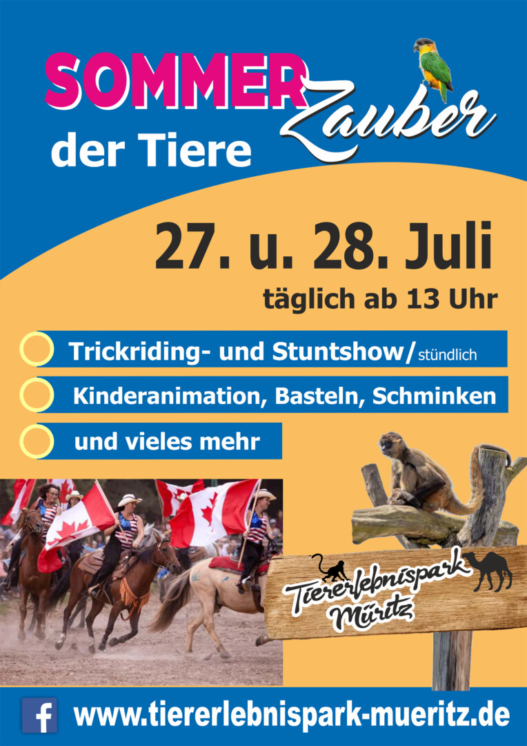 Diesen Termin für das kommende Wochenende sollten sich die Müritzer und Gäste schon mal vormerken: Am Sonnabend und Sonntag findet im Tiererlebnispark Müritz in Grabowhöfe der „Sommerzauber der Tiere“ statt. Jeweils ab 13 Uhr beginnt die große Stunt- und Trickriding-Show. Dabei werden die „Comanchen“ aus Neu Poserin mit ihren 20 Reitern und Pferden ein tolles Spektakel vollführen.