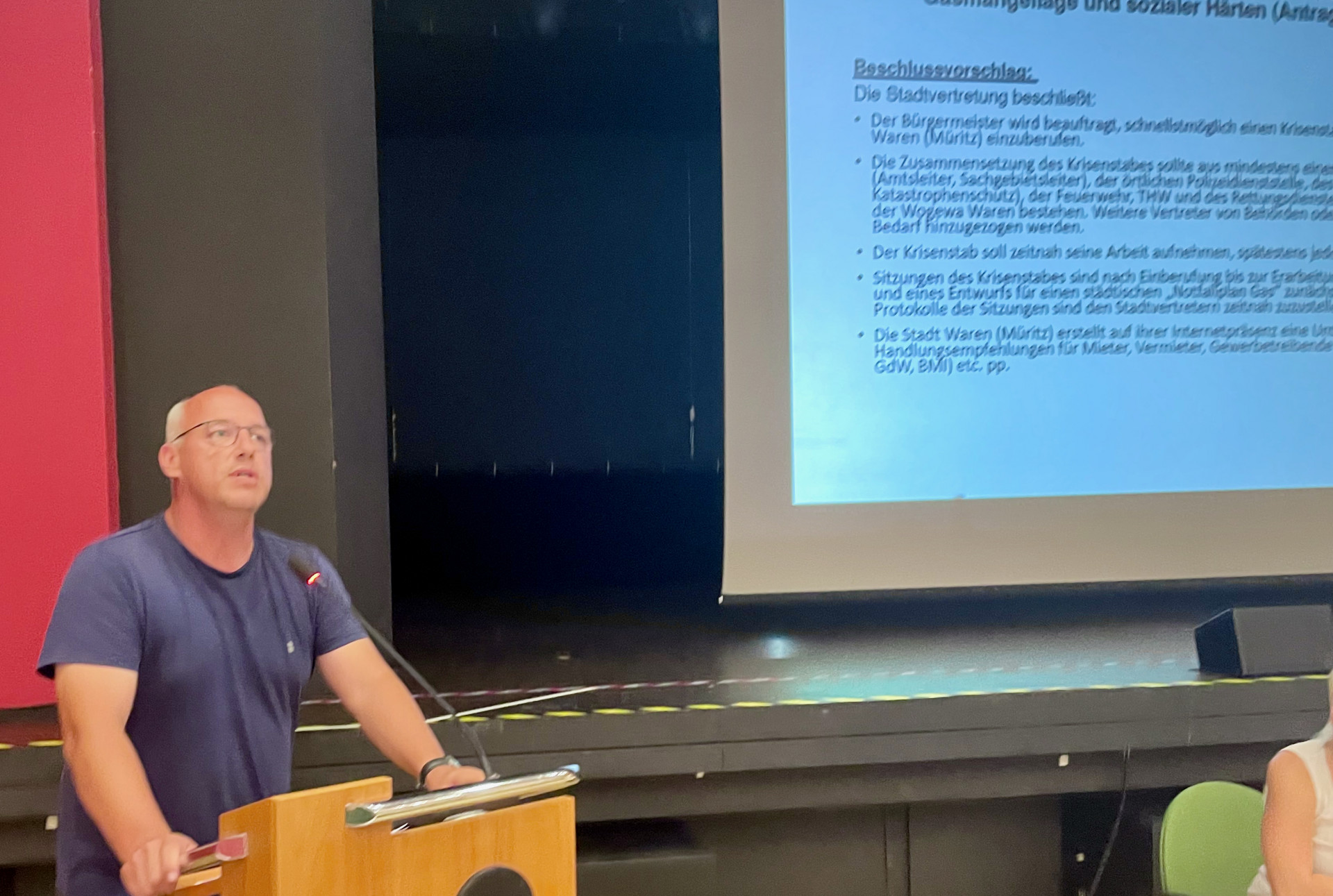 „Wenn Gas weg ist, ist Gas weg“. Klare Aussage des Geschäftsführers der Warener Stadtwerke, Michael Hübner. Viel mehr Worte machte der Chef des größten Versorgers in der Region rings um Waren nicht auf der Sondersitzung der Warener Stadtvertreter gestern Abend. Die Sitzung wurde von der AfD-Fraktion zur „Energiekrise“ gefordert, unter anderem, um einen Krisenstab zu bilden, damit man in Waren auf den Fall der Fälle vorbereitet ist. Um es vorweg zu nehmen: Der Krisenstab wird nicht gebildet, was allerdings nicht heißt, dass man in Waren nichts tut. Doch am Anfang der Sitzung, nämlich beim Bericht des Bürgermeisters, beschlich den einen oder anderen Zuhörer schon das Gefühl, dass die Stadt Waren alles auf sich zukommen lässt. Ganz nach dem Motto: Zuständig sind andere – der Kreis, das Land, der Bund. Das haben auch die Zuschauer – für eine Stadtvertretersitzung waren es sehr viele – so empfunden.