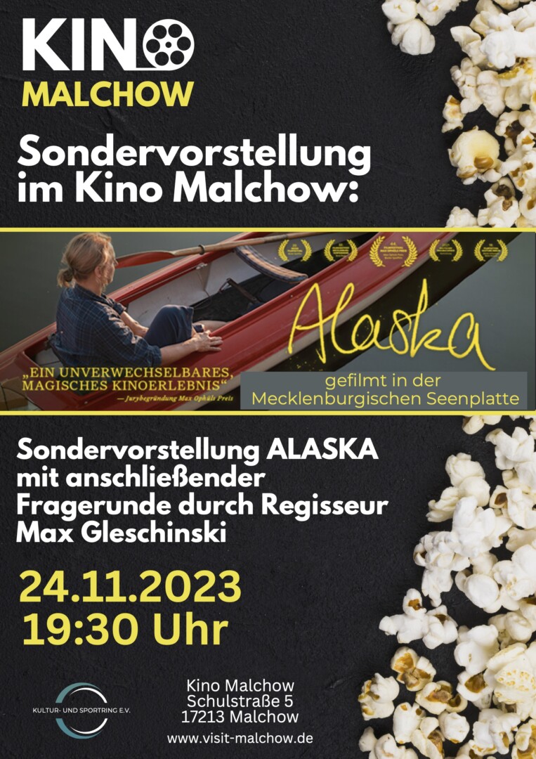 Kino-Freunde kommen am Freitag, 24. November, in Malchow auf ihre Kosten. Um 19.30 Uhr beginnt im dortigen Kino eine Sondervorstellung. Beim Film „Alaska“ zeigt sich die Mecklenburgische Seenplatte als magischer Ort. Dieses Drama wurde nicht nur in unserer Heimat verfilmt, sondern handelt auch in der Mecklenburgischen Seenplatte. Drehbuchautor und Regisseur Max Gleschinski wird selbst mit vor Ort sein, um ein paar Details zu den Hintergründen und der Entstehung seines vielfach preisgekrönten Filmes zu verraten. Im Anschluss an die Filmvorführung können die Zuschauer noch Fragen an den Regisseur stellen. Eintritt 6,50 € p.P.