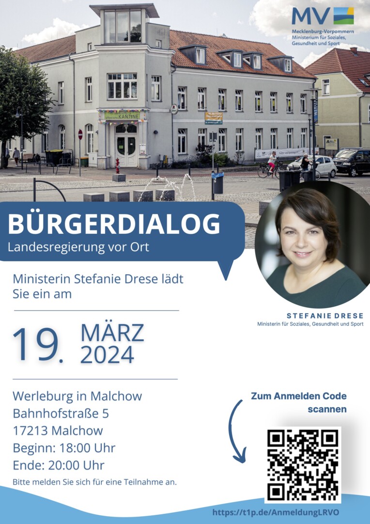 Das Bürgerforum mit Ministerin Drese findet am 19. März um 18 Uhr in der Werleburg Malchow (Bahnhofstraße 5, 17213 Malchow) statt. Für Getränke und einen kleinen Imbiss ist gesorgt. Ein behindertengerechter Zugang ist vorhanden. Aus organisatorischen Gründen wird um Anmeldung unter https://t1p.de/AnmeldungLRVO oder per E-Mail an pressestelle@sm.mv-regierung.de gebeten.