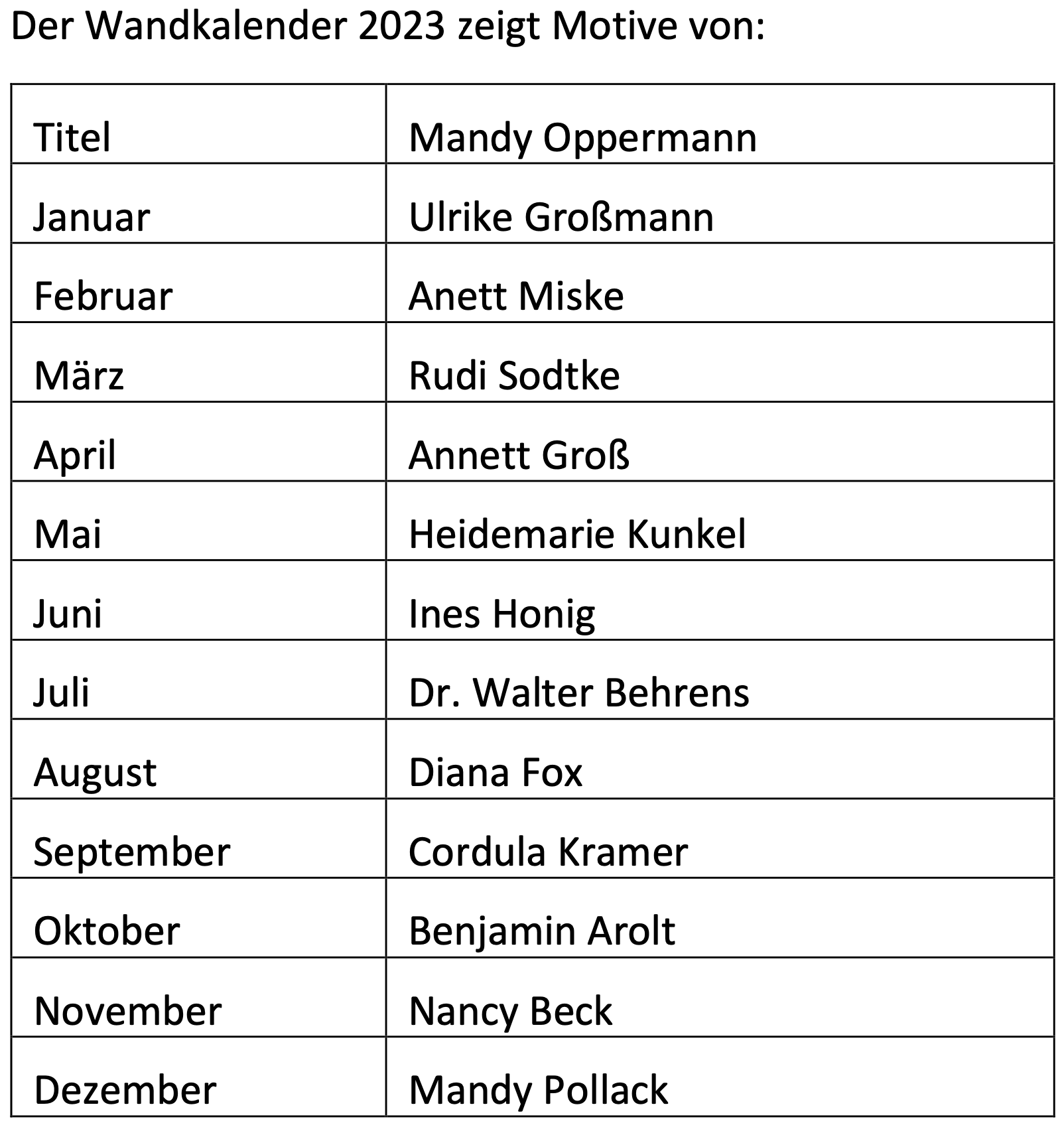 Der Kalender ist wie immer kostenlos, jedoch wird bei der Ausgabe der Kalender um eine freiwillige Spende von einem Euro gebeten. „Diese Gelder werden zu 100 Prozent an soziale und gemeinnützige Projekte weitergegeben“, informiert Andrea Perlick. „Mit den Spenden aus dem letzten Kalender konnten notwendige Anschaffungen getätigt und lange geplante Vorhaben in die Tat umgesetzt bzw. begonnen werden.“