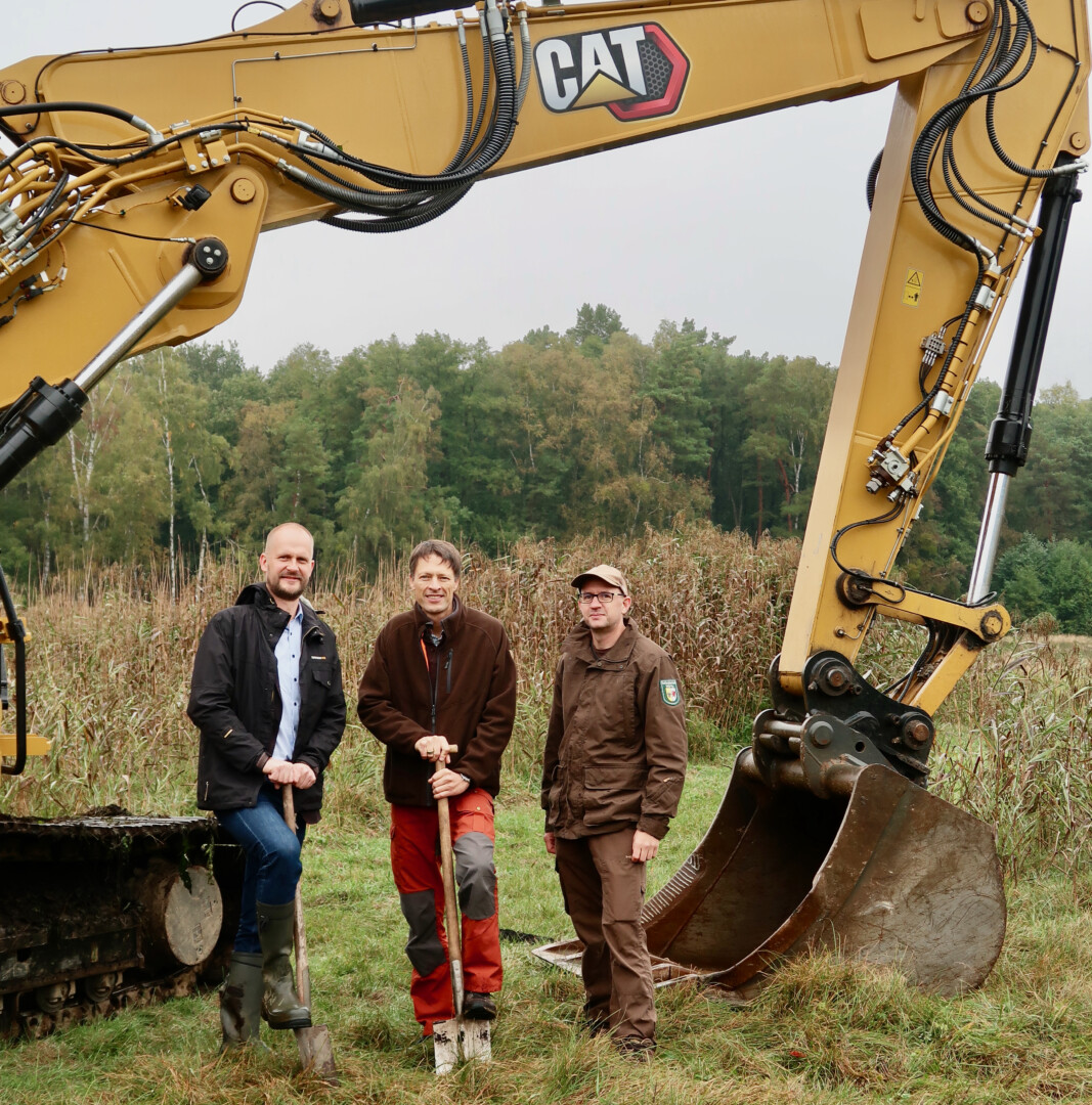 Bild: Spatenstich für die Wiedervernässung der Steinstückenwiese: Axel Schümann, Marketingleiter Güstrower Schlossquell, Amtsleiter Ulf Zimmermann, Dezernent Dr. Sven Rannow (von links).