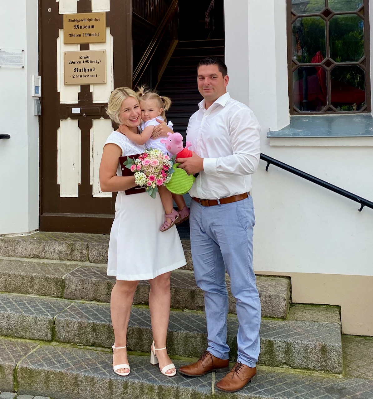 Lediglich die kleine Tochter Karla war mit dabei. Doch die kleine Dame im weißen Kleidchen und mit niedlichen Zöpfen hat sich nicht so sehr für die Trauungs-Zeremonie interessiert, sondern wollte lieber die Treppen im Standesamt hoch und runter klettern.