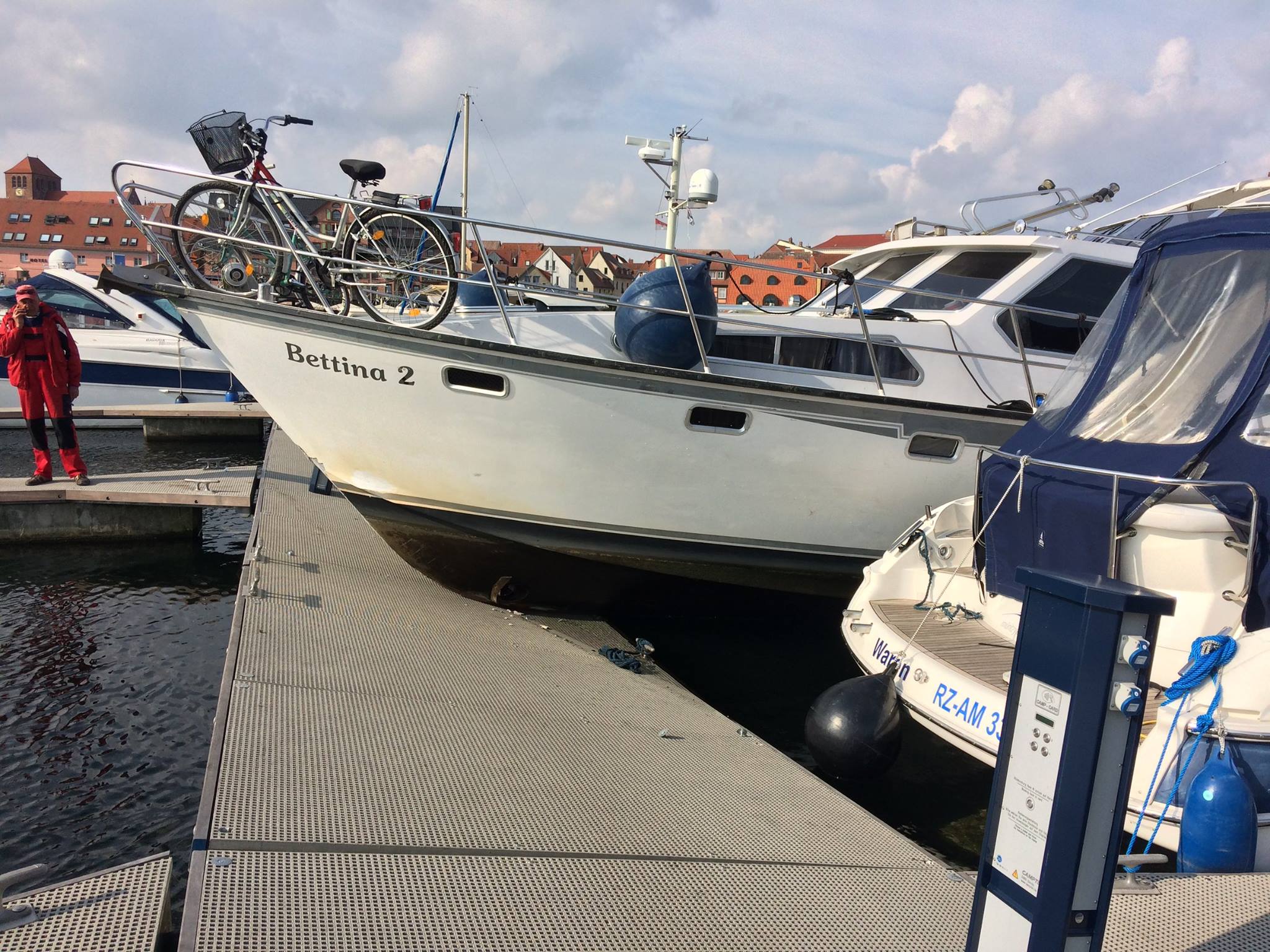 Wir haben gestern über den Unfall eines Charterbootes im Warener Hafen berichtet. Das Boot ist vermutlich wegen eines technischen Fehlers auf einen Steg gefahren und dort „aufgebockt“.