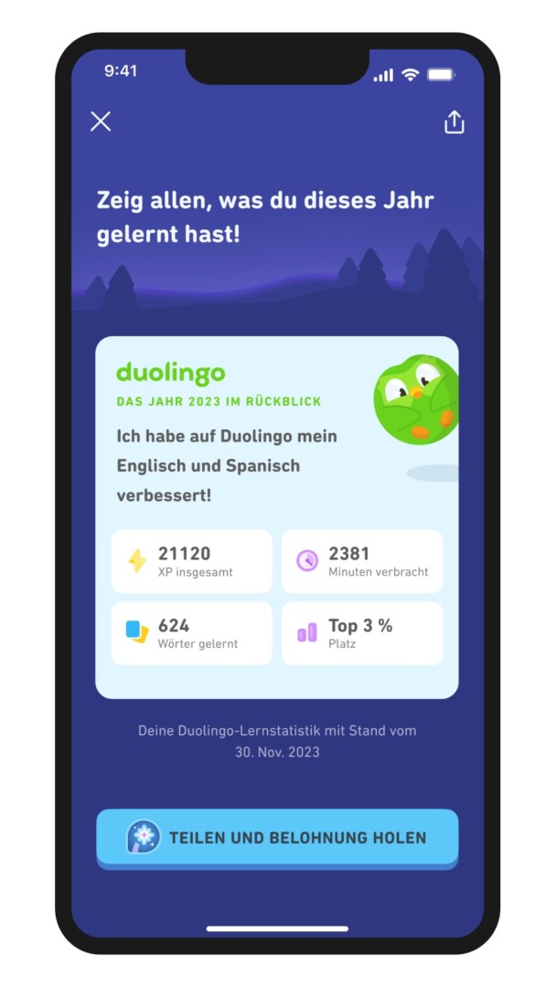 Der Duolingo-Sprachreport 2023 basiert auf Daten von Lernenden, die zwischen dem 1. Oktober 2022 und dem 30. September 2023 auf Duolingo Sprachen gelernt haben. Die Daten wurden nach Land oder Sprache zusammengefasst, um die personenbezogenen Daten der Lernenden zu schützen. Die Zusammenstellung der Länder basiert auf international anerkannten, unabhängigen, selbstverwalteten Einheiten, wie hier beschrieben. Die Daten zu Alter und Lernmotivation beruhen auf eigenen Angaben der Lernenden. Lernende unter 13 Jahren wurden nicht in die Analyse einbezogen. Aus Datenschutzgründen wurden Länder mit weniger als 5.000 Duolingo-Lernenden nicht bewertet.