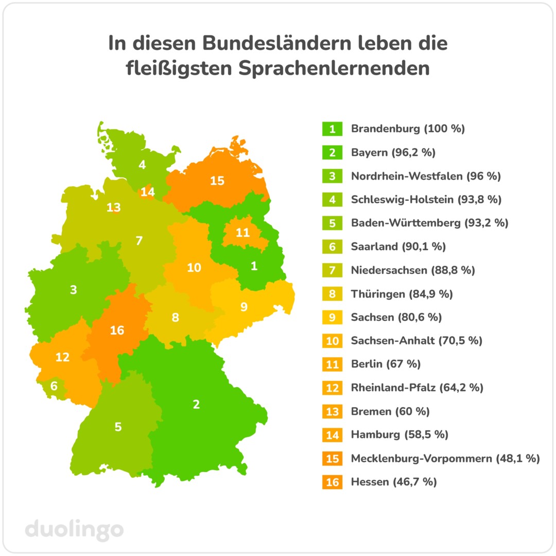 Aber wo in Deutschland wird eigentlich am fleißigsten gelernt? Das zeigt der Bundesländer-Vergleich. Klarer Sieger: Brandenburg. In keinem anderen Bundesland waren die Duolingo-Nutzenden 2023 aktiver. Gemessen an diesem ersten Platz (100 %) sind die Sprachenlernenden in Hessen und Mecklenburg-Vorpommern, den Schlusslichtern des Rankings, nicht mal halb so lernfreudig, wie die Infografik zeigt: