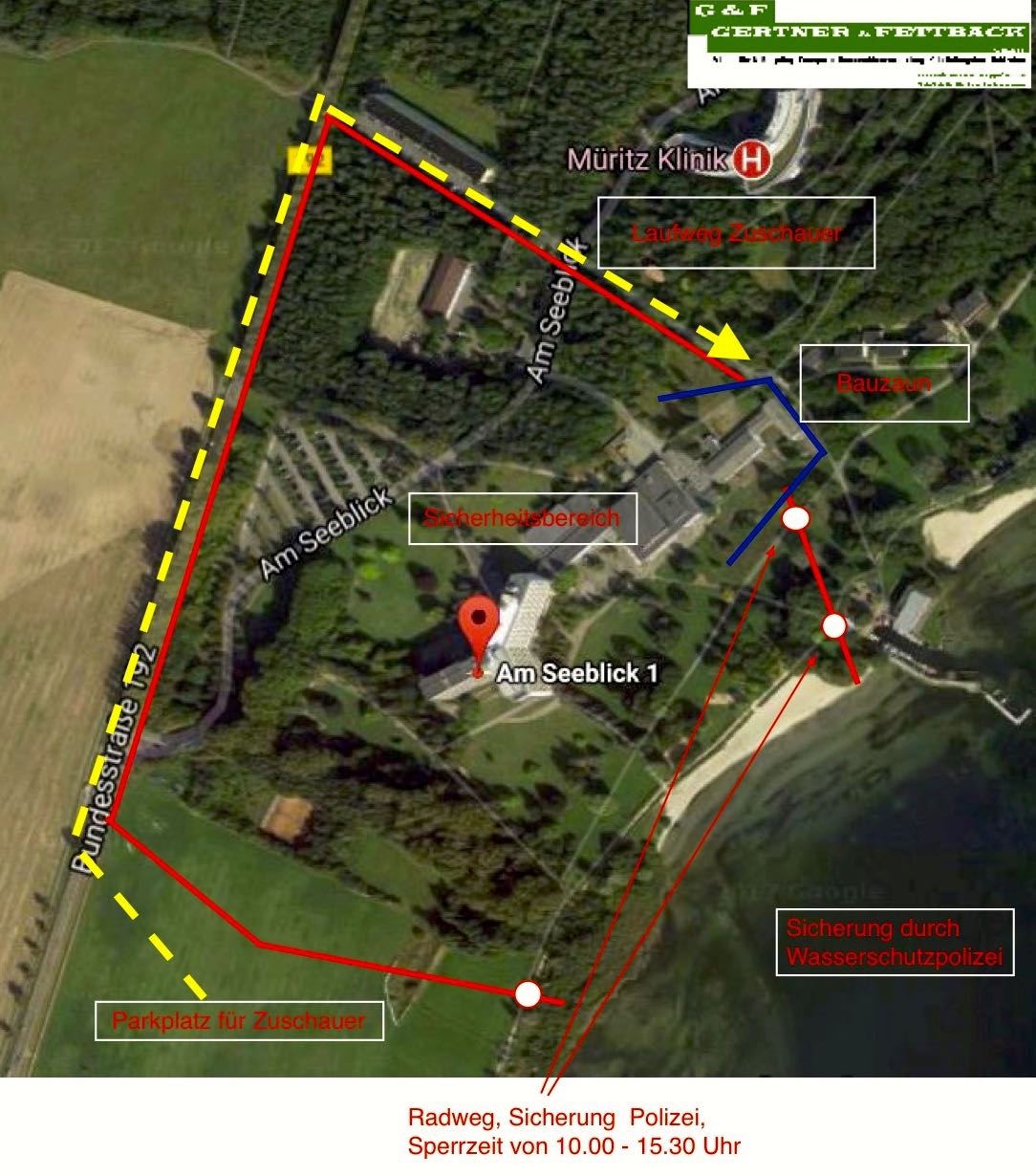 Die Wasserschutzpolizei wird wasserseitig einen Sperrradius gemessen ab dem Müritz Hotel von 300 Metern einrichten. „Wir weisen alle Verkehrsteilnehmer daraufhin, die