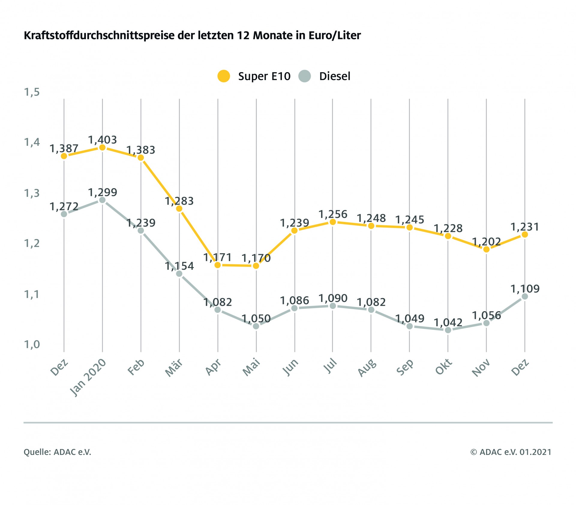 Mit der leichten Erholung des Ölpreises (Sorte Brent) zogen auch die Spritpreise wieder spürbar an, wenngleich der Euro fester notierte und diesen Effekt dämpfte. Dies zeigt auch die Auswertung der Werte vom Dezember 2020. Wie der ADAC ermittelt hat, kostetet Super E10 im Dezember im Schnitt 1,231 Euro je Liter, das waren 2,9 Cent mehr als im November. Diesel kostete im Schnitt 1,109 Euro je Liter und verteuerte sich damit sehr deutlich um 5,3 Cent gegenüber dem Vormonat.