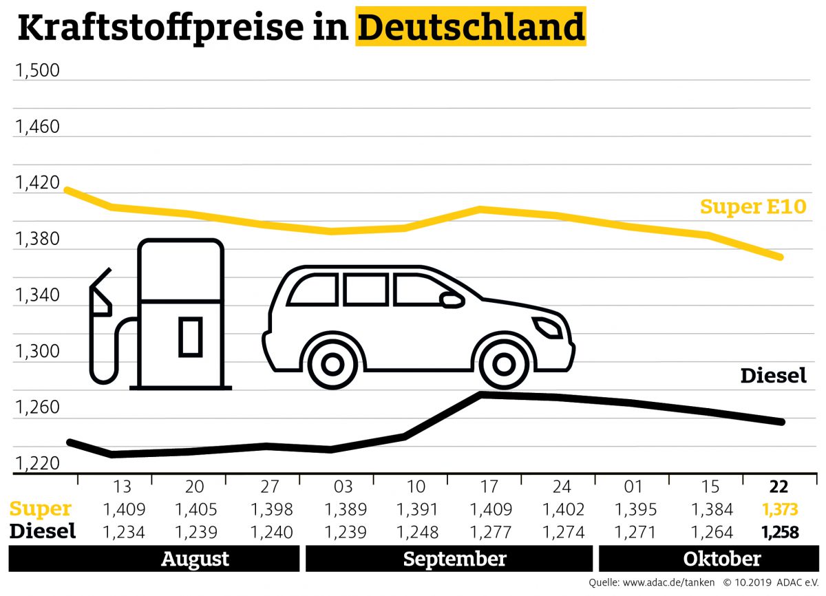 Autofahrer müssen für ihren Sprit erneut weniger bezahlen. Laut aktueller Auswertung des ADAC verbilligte sich Super E10 gegenüber der Vorwoche im Bundesmittel um 1,1 Cent auf 1,373 Euro je Liter. Damit ist diese Woche die günstigste Tankwoche seit März. Ein Liter Diesel kostet durchschnittlich 1,258 Euro, das ist ein Rückgang um 0,6 Cent.