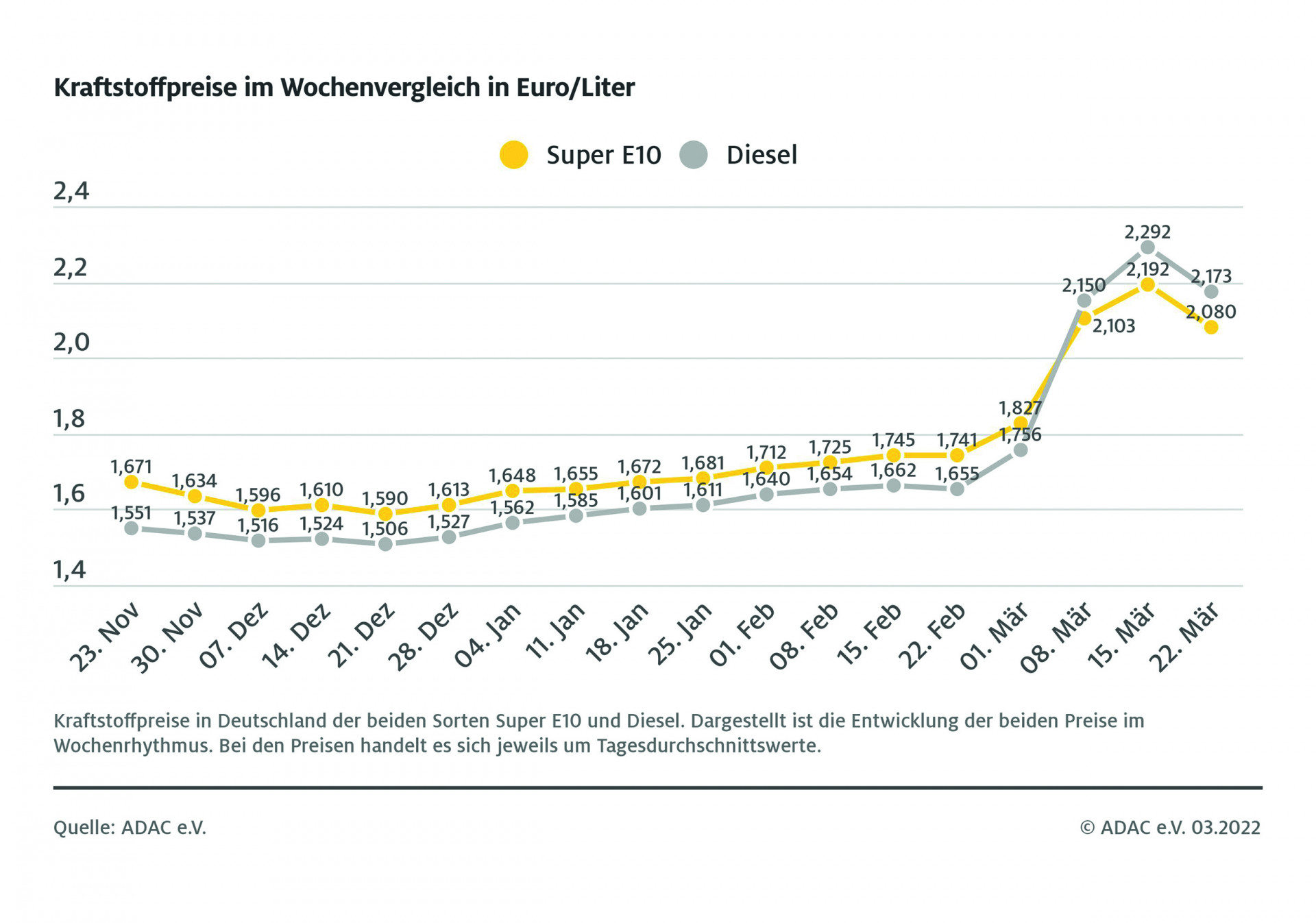 Tanken ist gegenüber der Vorwoche ein gutes Stück preiswerter geworden. Wie die aktuelle ADAC Auswertung der Kraftstoffpreise zeigt, ist der Preis für einen Liter Super E10 seit vergangener Woche um 11,2 Cent gesunken. Danach kostet ein Liter derzeit im bundesweiten Mittel 2,080 Euro. Ähnlich deutlich ist auch der Preis für Diesel gefallen: Für einen Liter müssen die Autofahrer aktuell im Schnitt 2,173 Euro bezahlen, das ist ein Minus von 11,9 Cent. Seit vergangenen Freitag ist die aus Verbrauchersicht erfreuliche Entwicklung jedoch zum Stillstand gekommen.