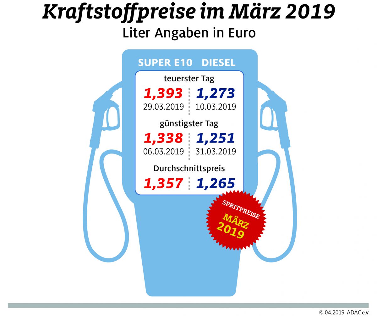Die Preise für Diesel und Super E10 sind im März im Vergleich zum Vormonat deutlich gestiegen. Laut der monatlichen Marktauswertung des ADAC kostete ein Liter Super E10 im bundesweiten Durchschnitt 1,357 Euro, das sind 3,2 Cent mehr als im Februar. Der Preis für Diesel stieg gegenüber dem Vormonat um 1,2 Cent auf 1,265 Euro.