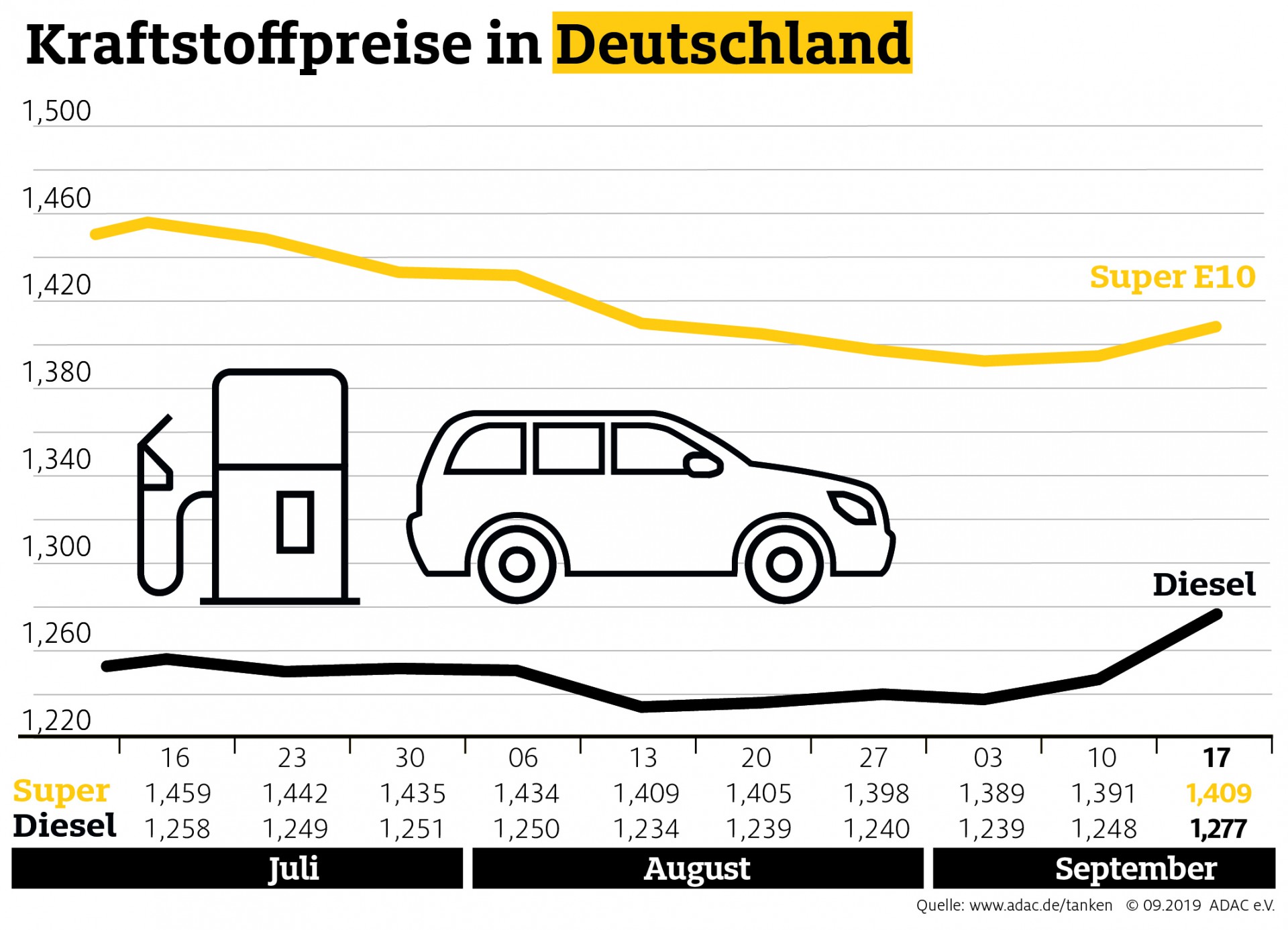 Tanken in Deutschland ist wieder spürbar teurer. Laut aktueller Auswertung des ADAC müssen Autofahrer für einen Liter Super E10 derzeit durchschnittlich 1,409 Euro bezahlen, das sind 1,8 Cent mehr als in der Vorwoche. Diesel verteuerte sich im Bundesmittel noch deutlicher auf 1,277 Euro je Liter, ein Anstieg von 2,9 Cent.
