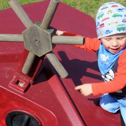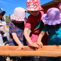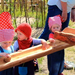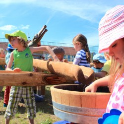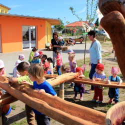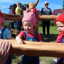 Gestern morgen dann die Überraschung: Die Anlage aus naturbelassenem Holz, die für Kinder aller Altersgruppen geeignet ist, stand auf dem Grundstück, durfte aber zunächst nur von Weitem bestaunt werden. Denn wie es sich gehört, gab’s eine Einweihung mit dem obligatorischen Band-Durchschneiden. Dann allerdings waren die Mädchen und Jungen nicht mehr zu halten, erkundeten die einzelnen Spielelemente und ließen sich auch durch nasse Shirts und Hosen nicht entmutigen.