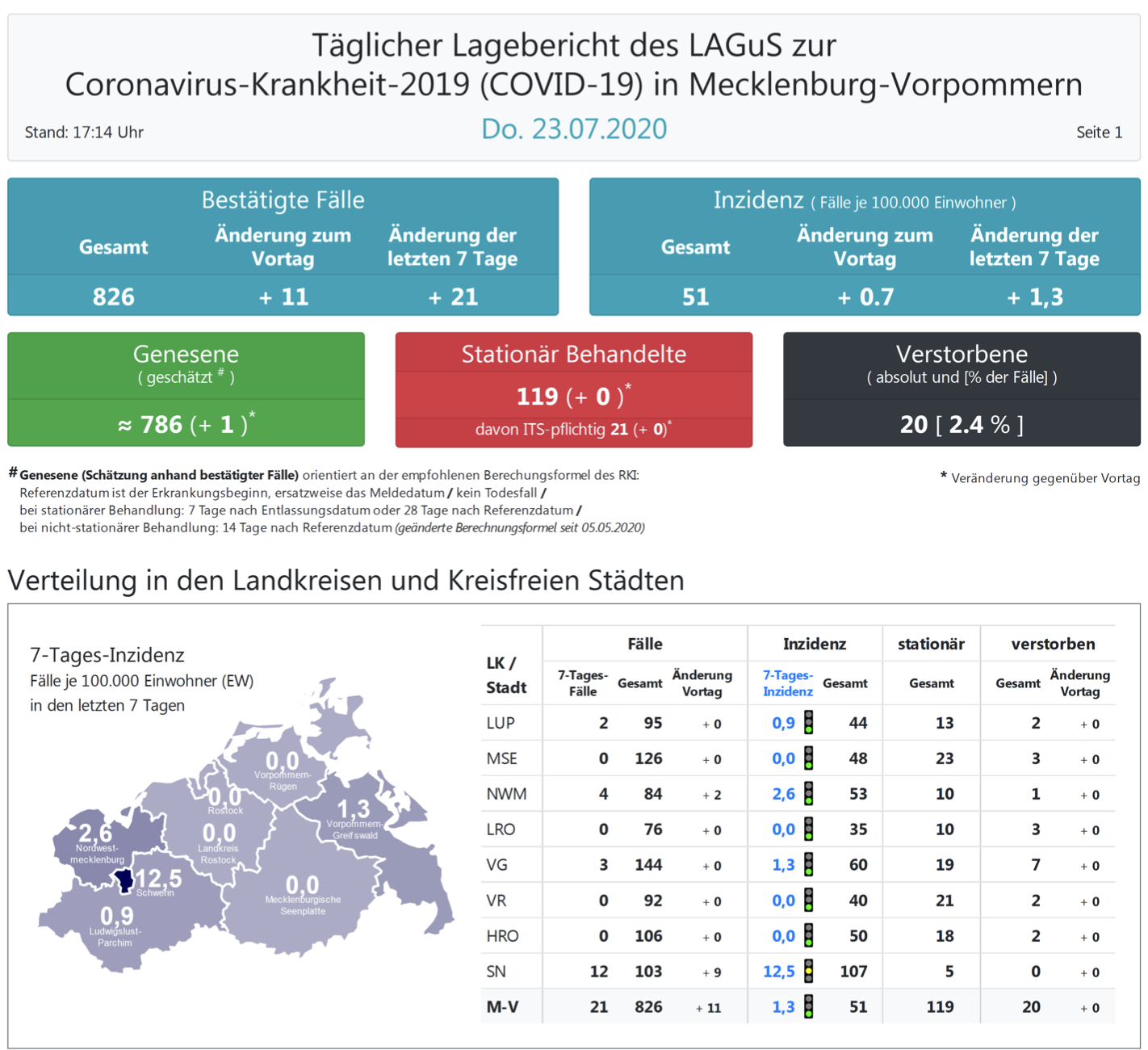 Damit werden heute elf COVID-19-Infektionen in MV gemeldet, die Gesamtzahl steigt zunächst auf 826.