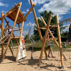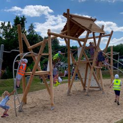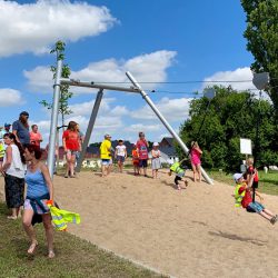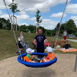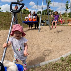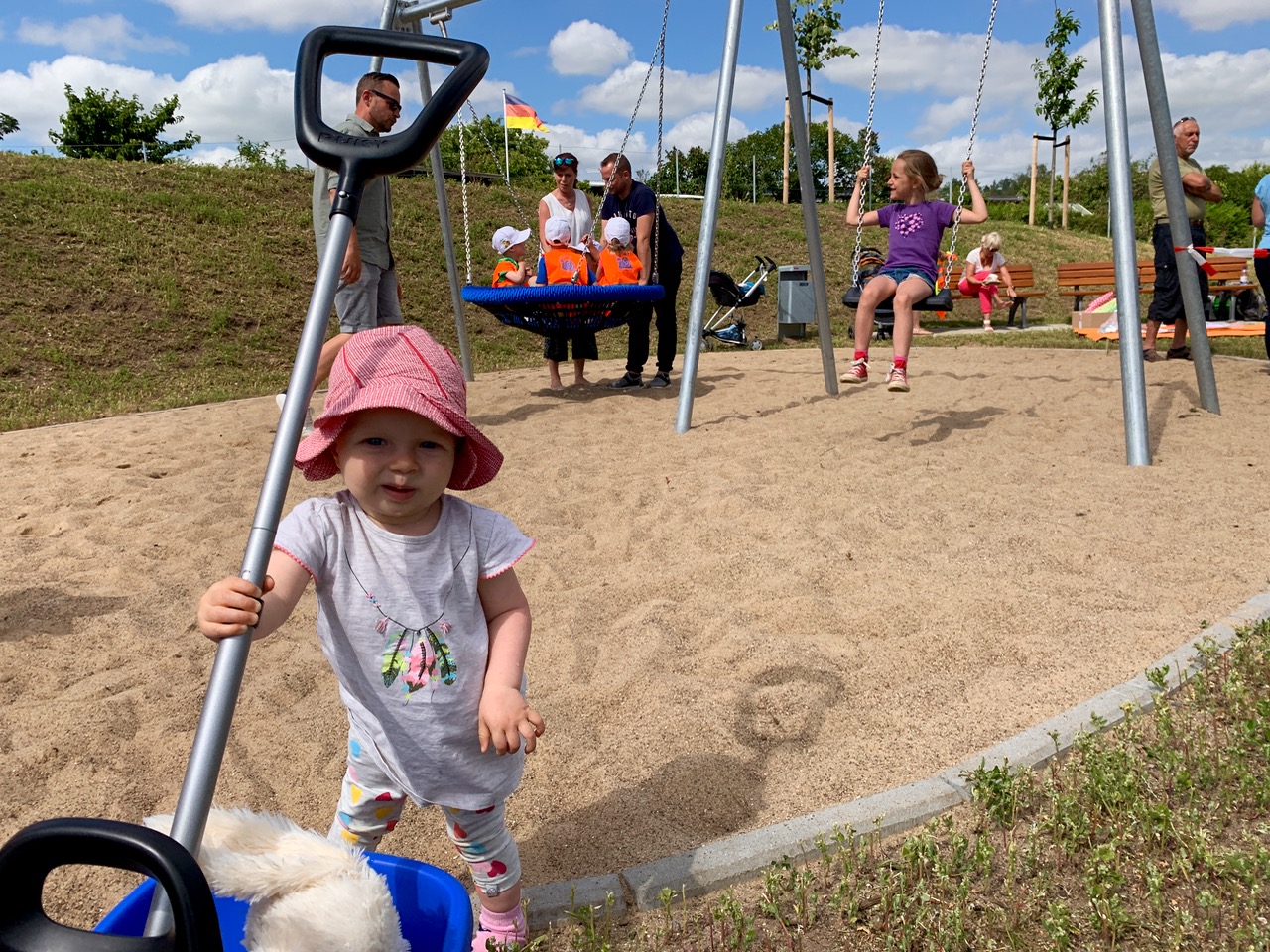 Zum neuen Platz gehören unter anderem die Klettereinheit „Fiasko“, die ihrem Namen wegen einer langen Lieferzeit alle Ehre machte, eine Doppelseilbahn, die gestern nach der Eröffnung gar nicht mehr still stand, ein Balltrichter, der nicht nur Baskeballfreunde begeistern dürfte, ein Spielgerät namens „Kamelritt“, bei dem Balance gefragt ist, verschiedene Schaukeln, eine extra breite Edelstahlrutsche und eine Stehwippe.