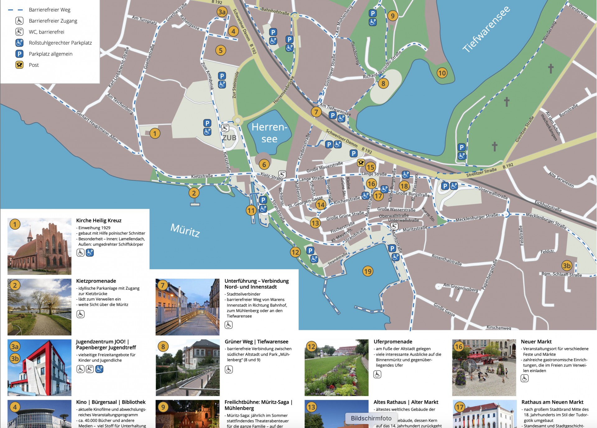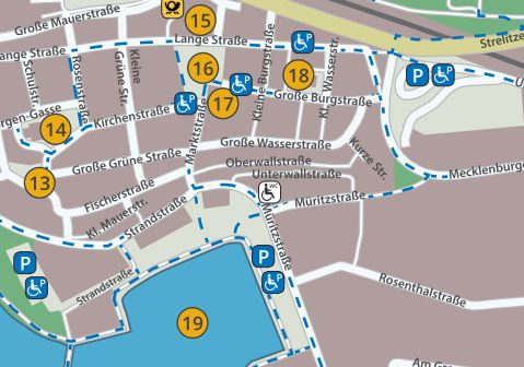 Die Stadt Waren hat gemeinsam mit dem Behindertenverband Müritz e.V. einen Stadtplan speziell für Menschen mit körperlichen Einschränkungen erstellt. Dieser Stadtplan soll den Touristen, aber auch den Bürgern der Stadt die Erkundung der touristischen Einrichtungen erleichtern. Damit können sich Urlauber bereits in Vorbereitung einer Urlaubsreise nach Waren über barrierefreie Angebote informieren und ihnen somit die Scheu vor einer Urlaubsreise genommen werden.