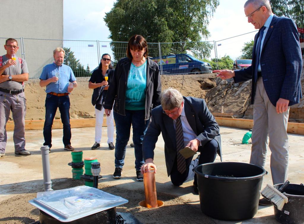 Foto im Text: Grundsteinlegung im Sommer für das neue Wohnhaus am Nesselberg.