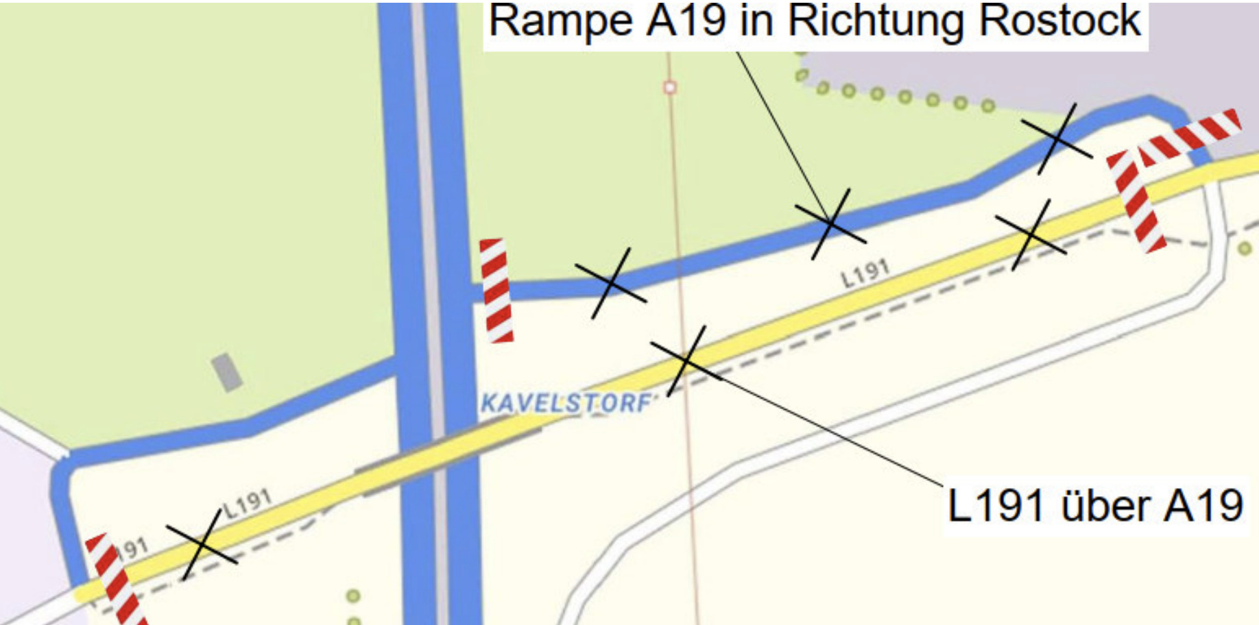 Das Auflegen der Behelfsbrücke startet heute nach Ende aller Vorbereitungen (u. a. Aufbauen des Krans, Lastverteilungsplatten auslegen, Stützen positionieren, Gegengewichte am Kran montieren). Voraussichtlich gegen 18 Uhr wird das erste Brückenteil eingesetzt. Durch die weitgehenden Bauarbeiten muss die Landesstraße 191 inklusive der Auf- und Abfahrtrampe Richtung Rostock bis zum 28. August voll gesperrt sein. Die A19 wird von heute bis morgen 8 Uhr zwischen der AS Kavelstorf und der AS Laage gesperrt (Sperrung in Richtung Rostock ab 10 Uhr, in Richtung Berlin ab 18 Uhr) Der Zeitraum wurde in Abstimmung mit den betroffenen Kommunen und im Austausch mit der Wirtschaft, in die verkehrstechnisch günstigeren Sommerferien gelegt.