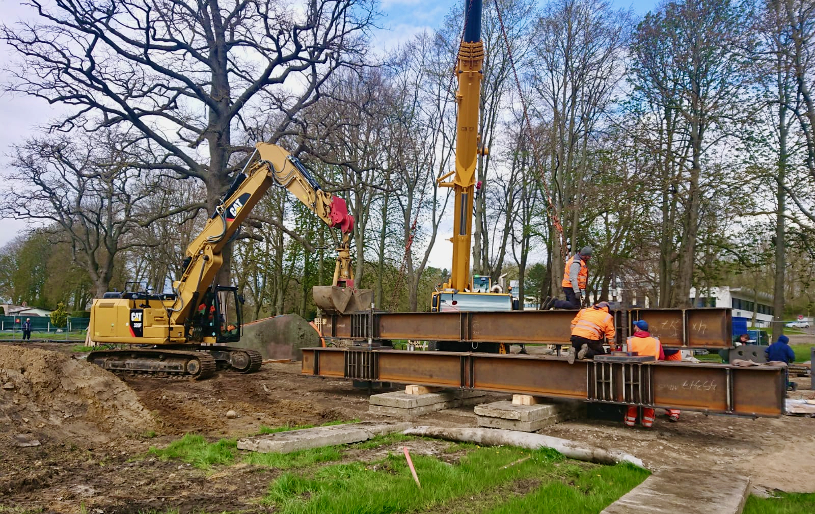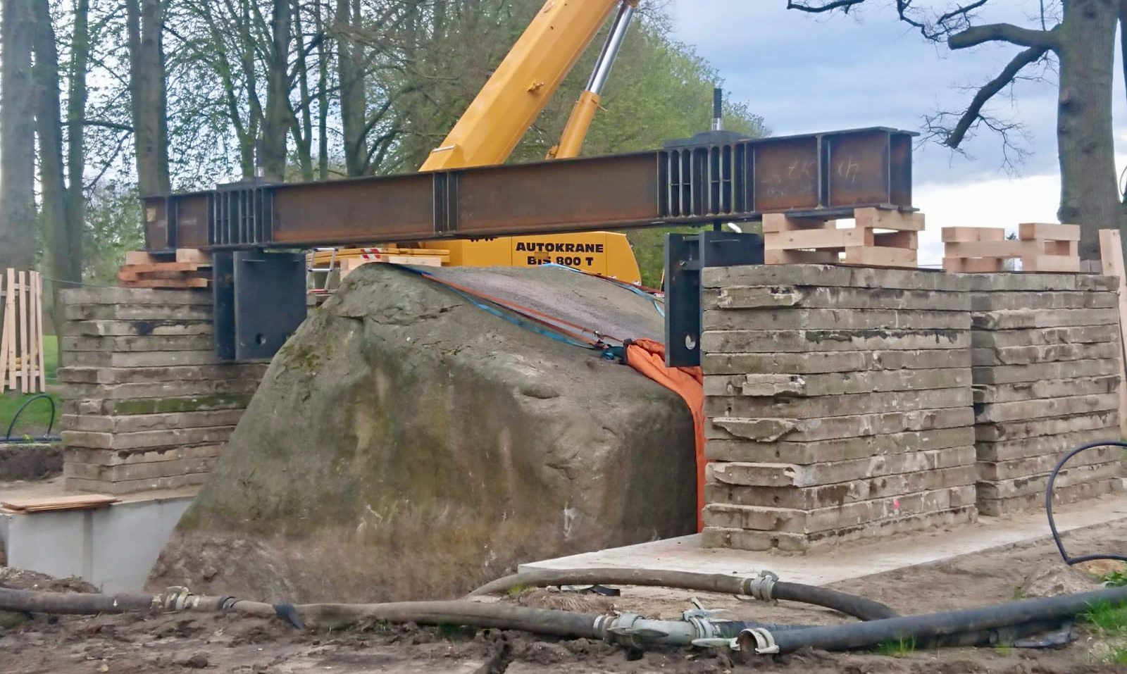 Die spektakuläre Stein-Hebeaktion in Altentreptow (WsM berichtete) geht in ihre heiße Phase. Am Dienstag haben Bauarbeiter der Wakubau Mirow die großen Stahlträger installiert, an denen der „Große Stein“ ab heute nach oben geholt werden soll. Die zwei riesigen Träger sind jeweils etwa zehn Meter lang und wiegen allein je sechs Tonnen. Sie wurden oberhalb des Findlings seitlich auf großen Betonplatten aufgelegt, die auf den Fundamenten ruhen. An ihren Kopfenden werden hydraulische Pressen platziert. Diese kommen heute und sollen die ganze Konstruktion – an den Trägern hängen dann die reißfesten Spezialgurte, die unter dem Stein entlang verlaufen und ihn heben sollen – ganz langsam anheben. Wenn man sieht, dass der acht Meter lange „Große Stein“ jetzt noch etwa nur zur Hälfte rausschaut, kann man schon ungefähr ermessen, wie riesig das Ganze am Ende aussehen wird.