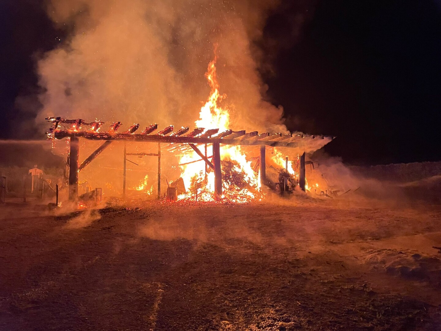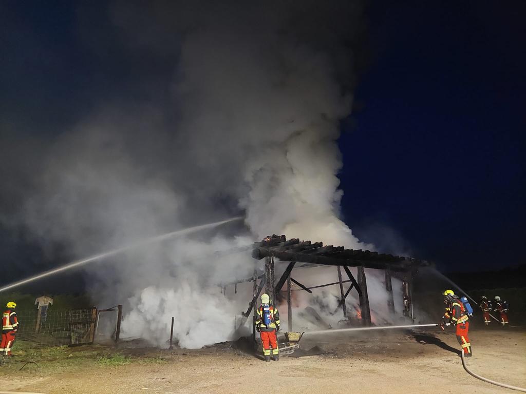 Anwohner hörten in der Nacht plötzlich einen Knall und sahen kurz darauf das Feuer. In dem Gebäude befanden sich ein Traktor, zwei Motorräder, Fahrräder und Holz.