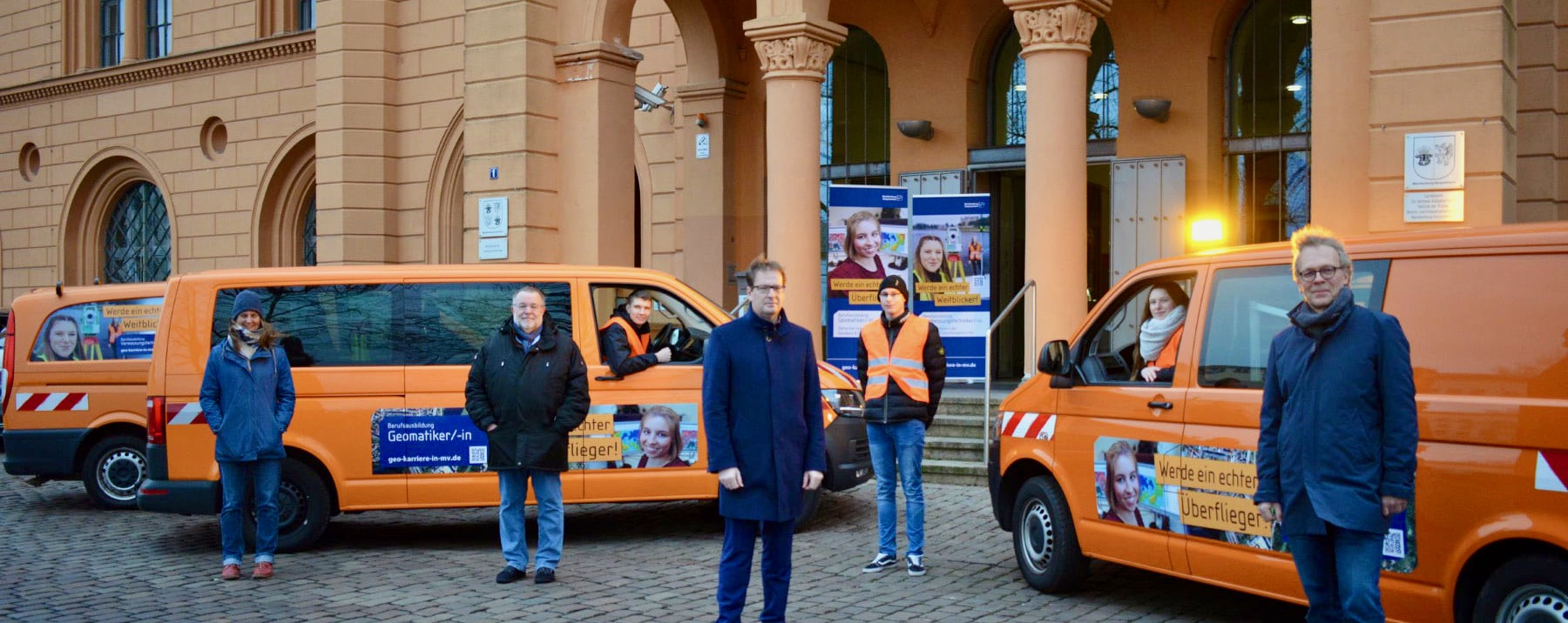 Ungewohnt bunt fahren die Dienstfahrzeuge der Geoinformations- und Vermessungsverwaltung zukünftig durch Mecklenburg-Vorpommern. Die farbenfrohe Beklebung der Fahrzeuge hat einen ernsten Hintergrund – es fehlen Fachkräfte. Durch die Werbekampagne wird das Berufsfeld der Geodäsie stärker und sichtbar in den Fokus gerückt. Innenminister Torsten Renz hat nun den Startschuss für eine Werbekampagne des amtlichen Geoinformations- und Vermessungswesen gegeben.