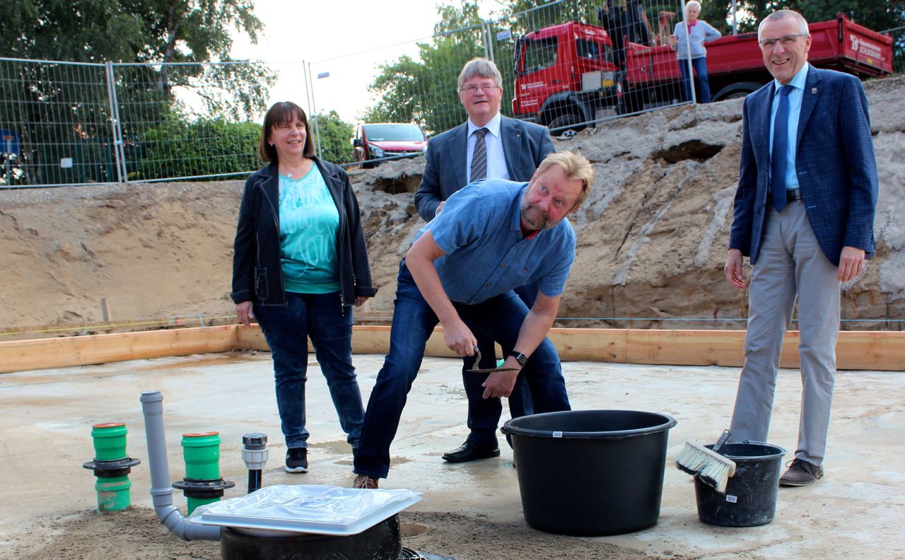 Mit der obligatorischen Grundsteinlegung haben WOGEWA-Chef Martin Wiechers und Warens Bürgermeister Norbert Möller heute den offiziellen Startschuss für den Bau von 28 neuen Wohnungen auf dem Nesselberg gegeben. Die Wohnungsbaugesellschaft baut damit nach über zehn Jahren erstmals wieder ein öffentlich gefördertes Haus und kann deshalb auch moderate Mieten anbieten.