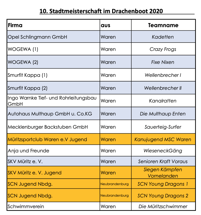Zum nunmehr schon 10. Mal steigen am morgigen Sonnabend, 12. September, auf dem Tiefwarensee die Drachenboot-Stadtmeisterschaften, organisiert und veranstaltet vom ESV Waren sowie der Wohnungsbaugesellschaft Waren (Wogewa). Der Startschuss für die 15 Teams fällt um 9.30 Uhr, die üblichen Corona-Regeln gelten natürlich auch bei diesem Event. Zuschauer sind herzlich willkommen, um die gastronomische Betreuung kümmert sich wieder das Brauhaus Reschke.
