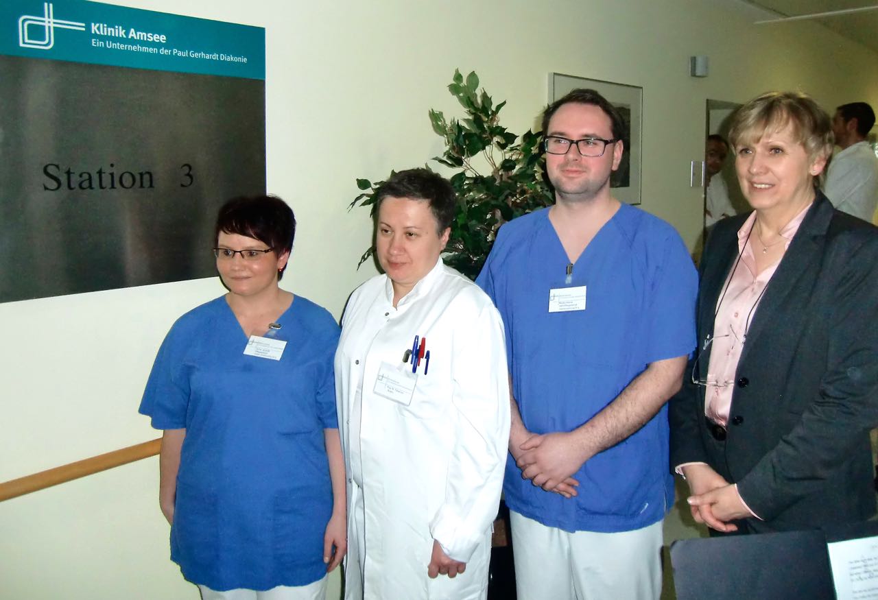 Foto unten: Anja Möller (stellv. Stationsleitung), Nadine Tabarina (Fachärztin), Marco Hähne (Stationsleitung) und Geschäftsführerin Dorothea Konrad freuen sich über die neue Station.