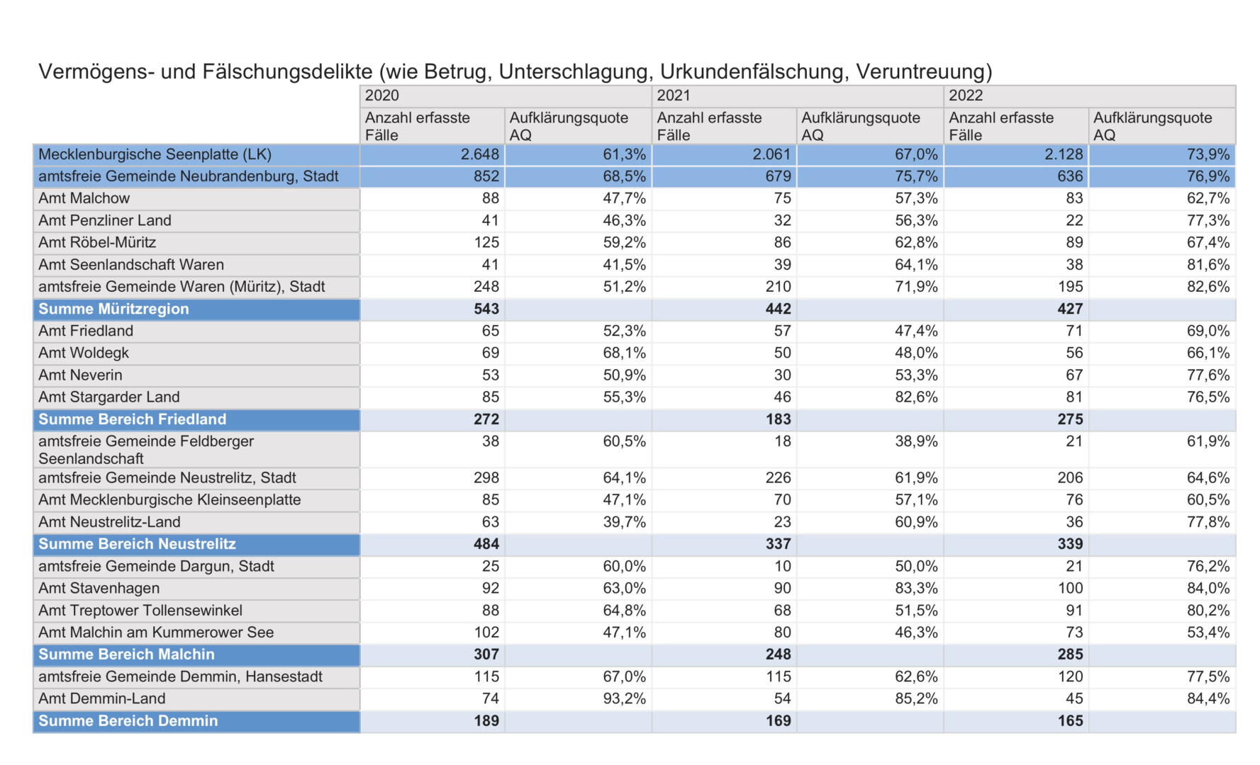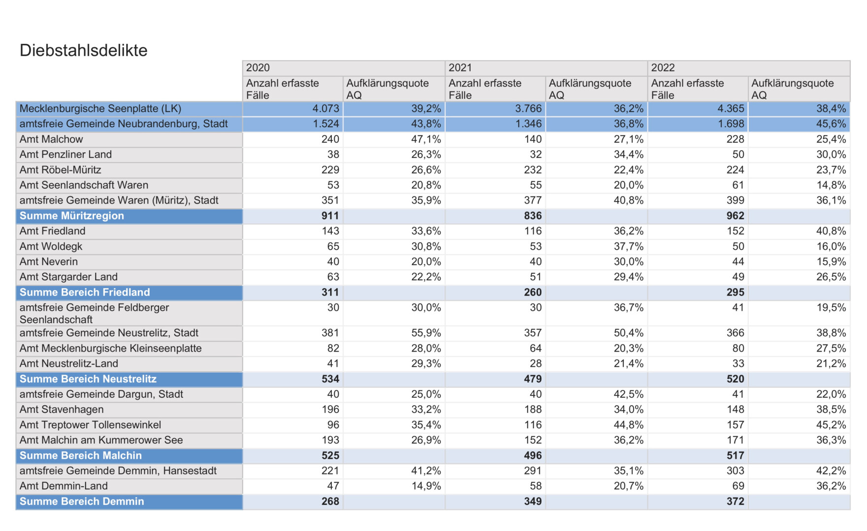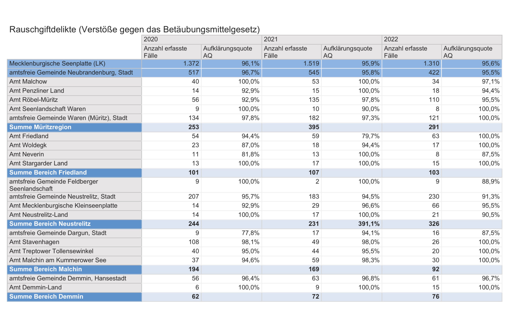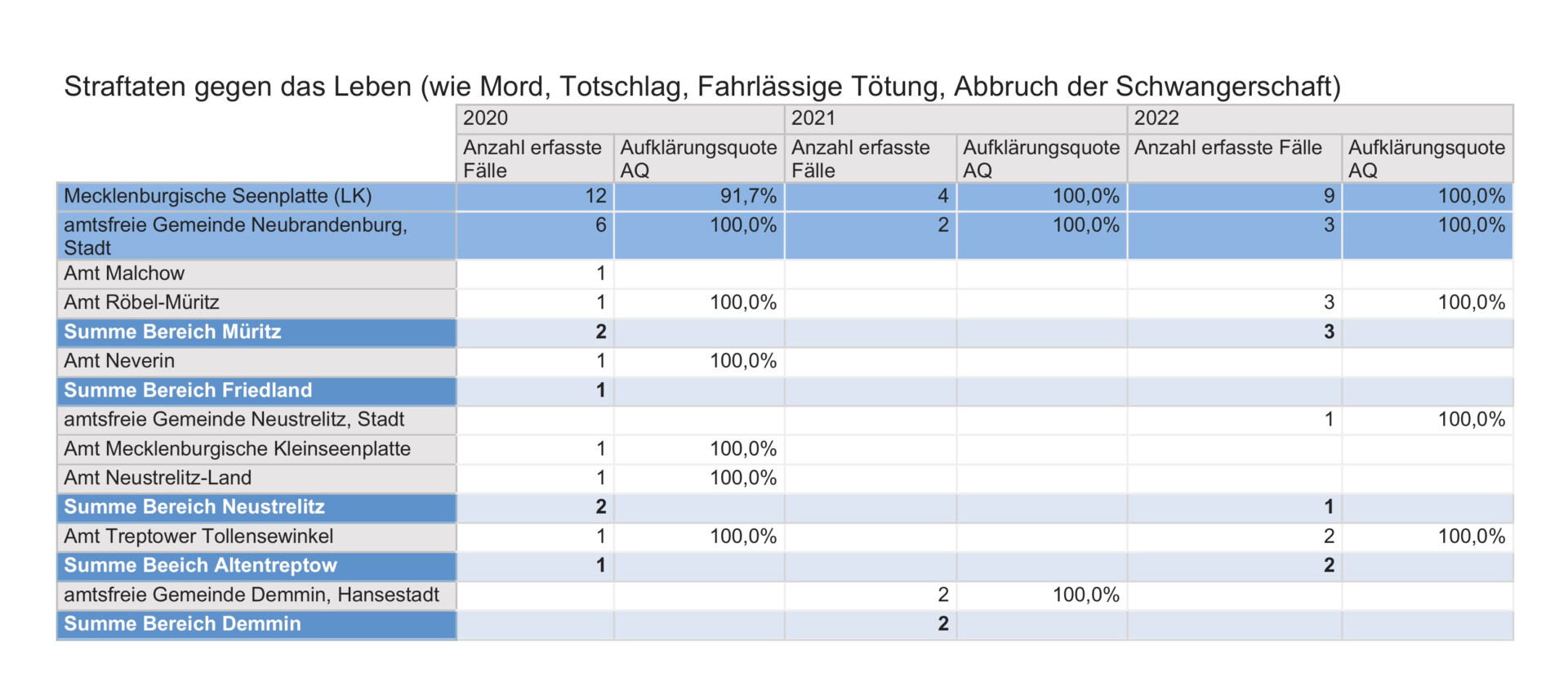Dagegen nahmen Rauschgiftdelikte, Vermögens- und Fälschungsdelikte ab. Straftaten gegen das Leben wie Mord und Totschlag gab es in der Müritz-Region laut Statistik drei – die Aufklärungsquote liegt hier bei 100 Prozent.