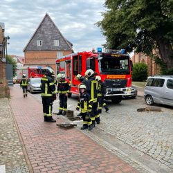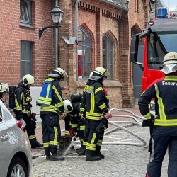 Ungewöhnlicher Einsatz für Warens Feuerwehr vor wenigen Minuten: Ein Postbote hat zum Glück schnell reagiert, als er aus einem Gulli in der Kirchenstraße mitten in Warens Innenstadt eine Stichflamme sah und es aus mehren Gullis qualmte. Und das Ganze unmittelbar neben geparkten Autos. Was genau in Warens Untergrund brannte, ist noch unklar, die Kameraden der Wehr waren aber sehr schnell zur Stelle.