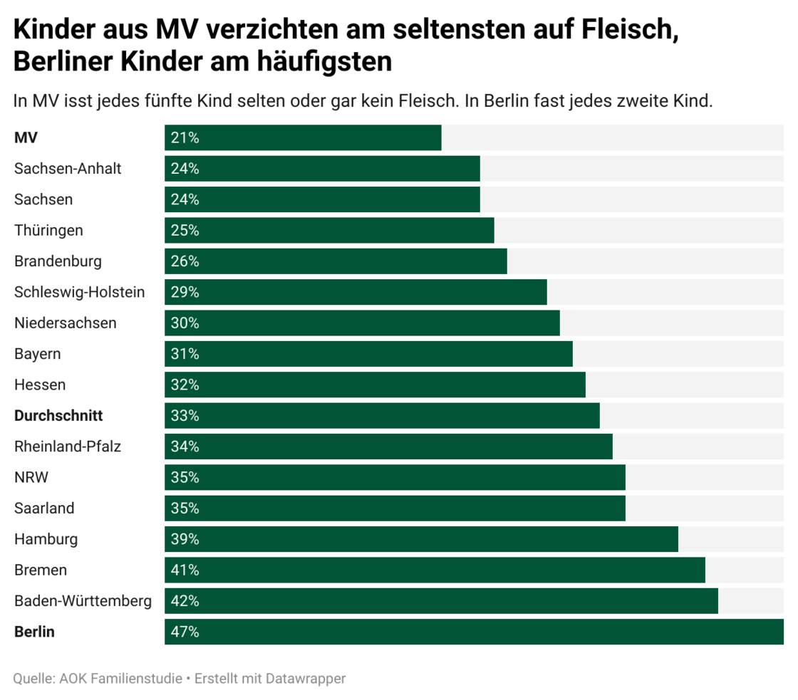 Bundesweit ist eine fleischreduzierte Ernährung laut der AOK-Familienstudie besonders in den Stadtstaaten Berlin (47 Prozent aller Kinder), Bremen (41 %) und Hamburg (39 %) sowie in Baden-Württemberg (42 %) angesagt. In den ostdeutschen Bundesländern hingegen ist der Trend zur fleischarmen Ernährung deutlich schwächer ausgeprägt. Schlusslicht ist Mecklenburg-Vorpommern, wo nur 21 Prozent der Kinder fleischreduziert oder vegetarisch ernährt werden.