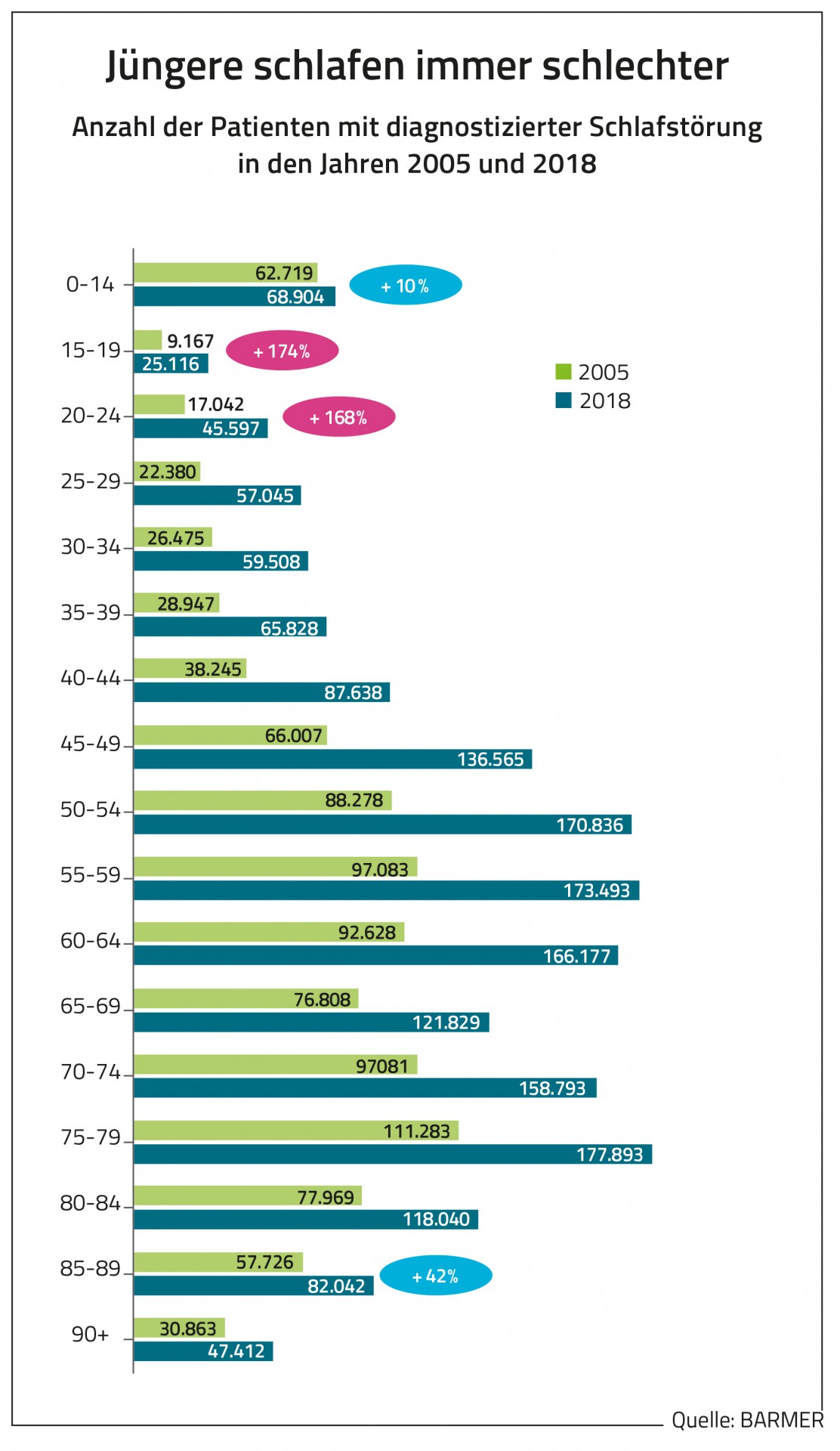 Immer mehr Teenager in Deutschland schlafen schlecht. Das geht aus einer aktuellen Analyse der Barmer hervor. Während Ärzte im Jahr 2005 bei 9.167 Personen im Alter von 15 bis 19 Jahren eine Schlafstörung diagnostizierten, waren 2018 bereits 25.116 junge Leute betroffen. Das entspricht einer Steigerung von 174 Prozent. Ein massives Plus um 168 Prozent von 17.042 auf 45.597 Betroffene gab es auch bei den jungen Erwachsenen zwischen dem 20. und 24. Lebensjahr. Erst ab dem 40. Lebensjahr flacht dieser Trend leicht ab.