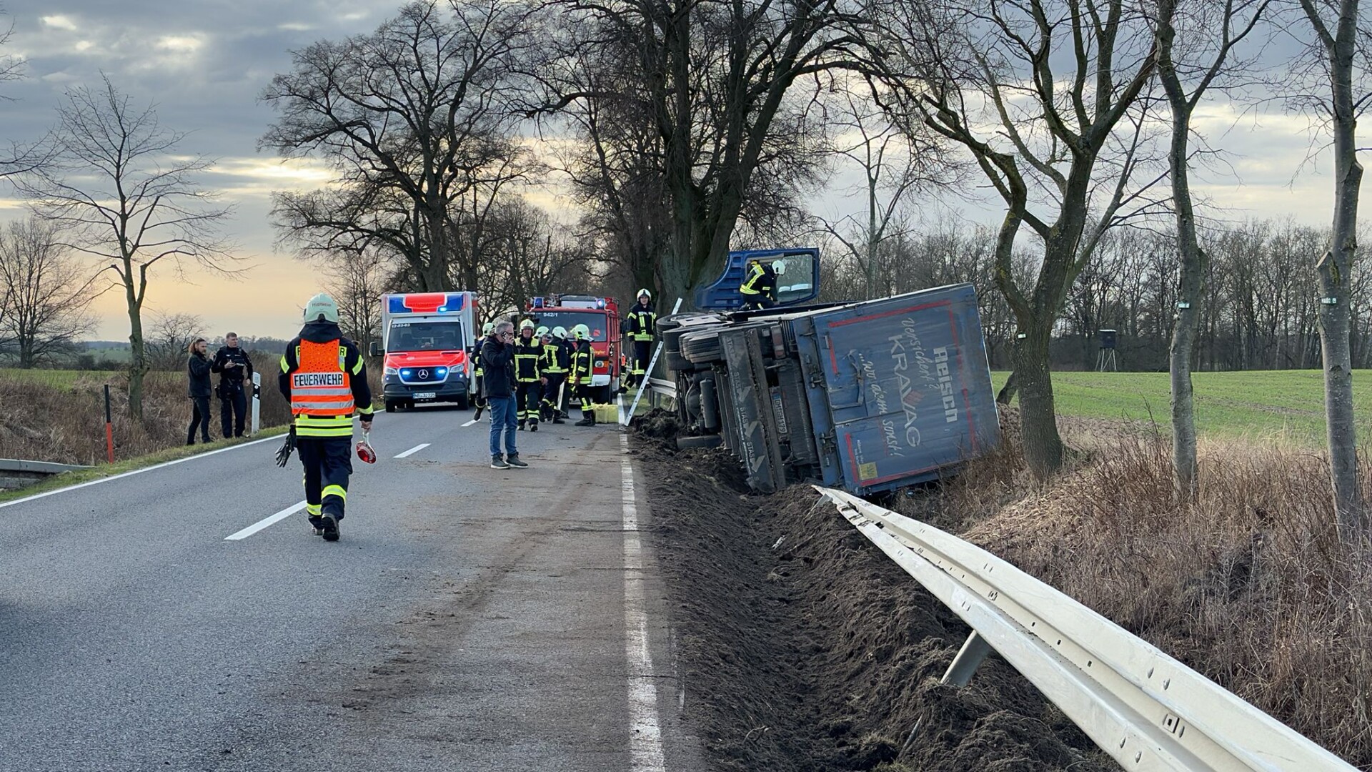 Ein mit Kartoffeln beladener Lkw ist heute Nachmittag auf der Bundesstraße 198 in Höhe Rehberg verunglückt. Eine stundenlange Vollsperrung war die Folge. Der Laster befuhr die B 198 von Woldegk in Richtung Neustrelitz als er von einem anderen Lkw überholt wurde. Der überholende Lkw scherte laut Polizei zu früh wieder nach rechts ein. Der Fahrer des verunfallten Lkw musste ausweichen, kam nach rechts von der Straße ab und kollidierte mit der Leitplanke. In weiterer Folge kippte der Laster auf die Seite. Der 59-jährige Fahrer wurde vor Ort durch den Rettungsdienst untersucht, blieb aber unverletzt. Am Lkw entstand ein Sachschaden von ca. 20.000 Euro. Die Feuerwehren aus Woldegk, Rehberg und Bredenfelde waren mit insgesamt 45 Kameraden im Einsatz. Der andere Lkw setzte seine Fahrt fort. Die Polizei ermittelt deshalb wegen des Verdachts der Verkehrsunfallflucht.