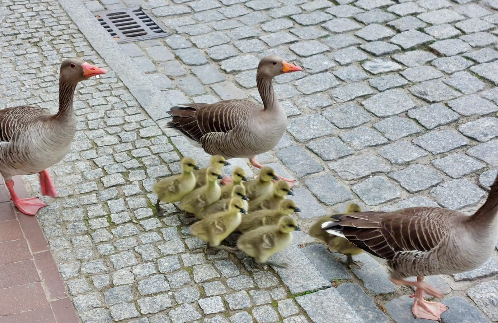 Immer nur am und auf dem Wasser umher dösen ist ja auch langweilig. Hat sich die tierisch süße Familie wohl auch gedacht und einen Ausflug in die Innenstadt von Waren gemacht. Allerdings kennen sich die watschelnden Stadtbummler nicht so gut mit den Verkehrsregeln aus und mussten von Passanten in der Kietzstraße mehrfach auf den Bürgersteig gescheucht werden. Und so endete der Ausflug im Bereich der Steinmole ohne besondere Vorkommnisse, wie es die Polizei beschreiben würde.