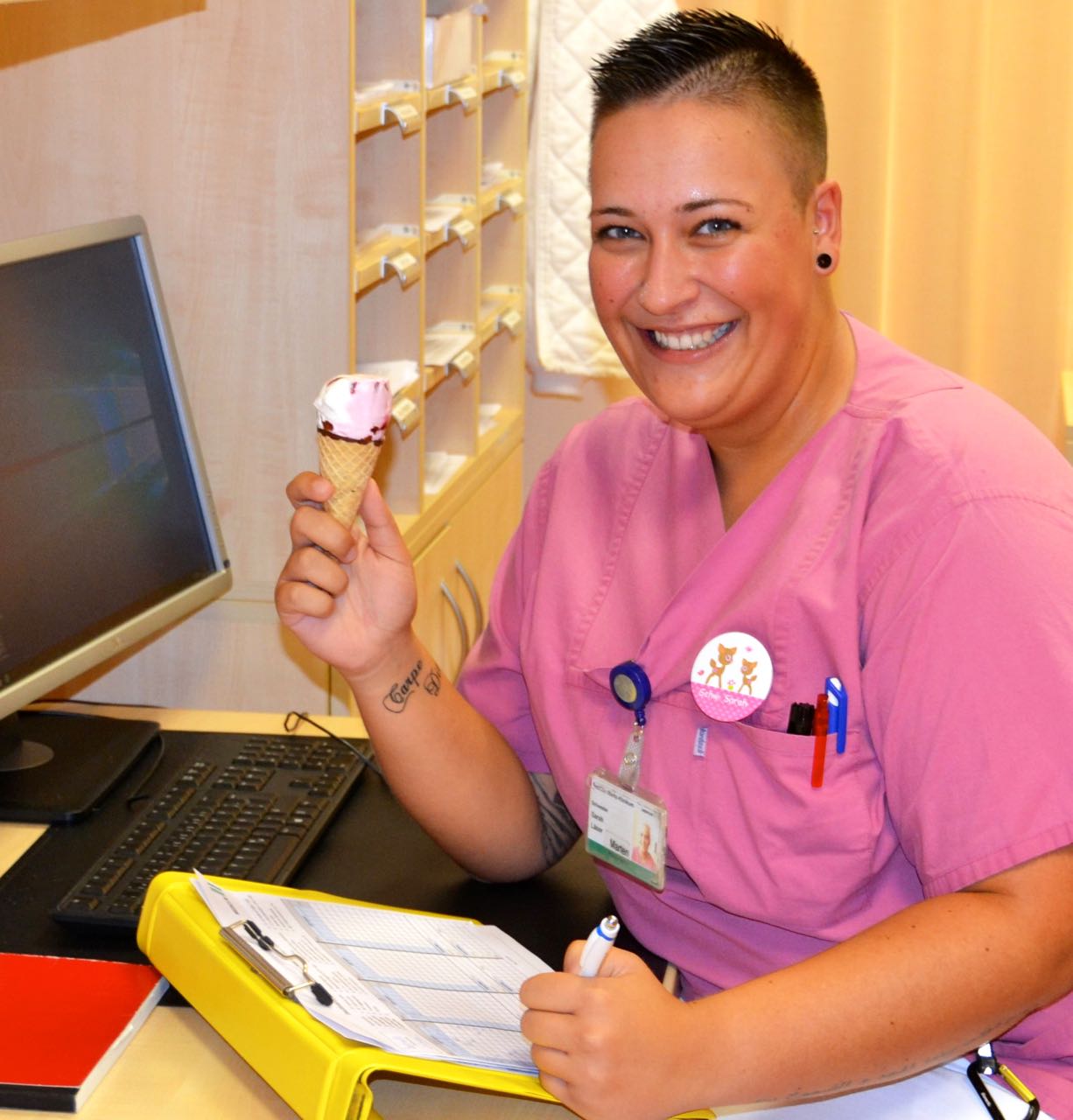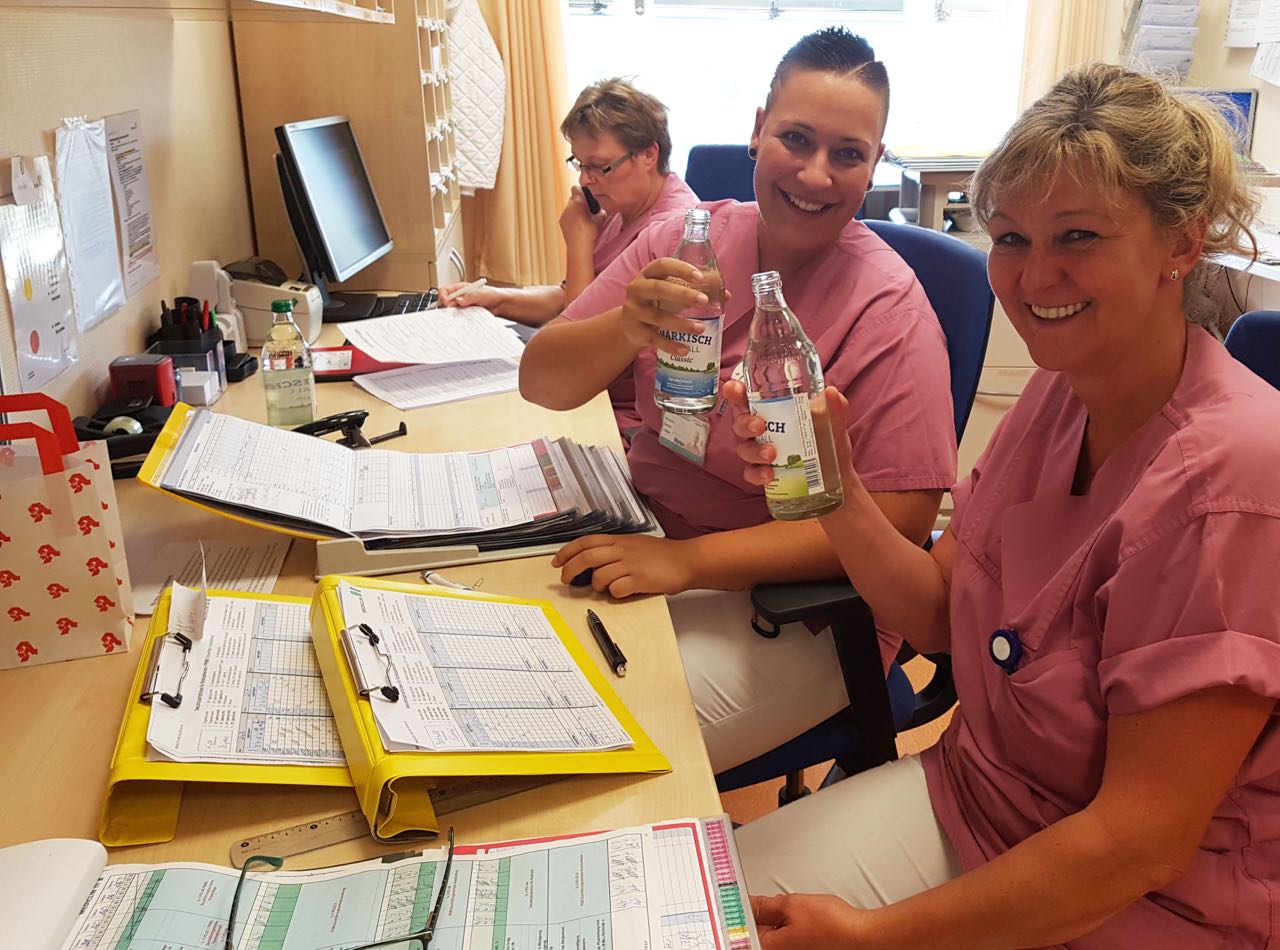 Aber auch die Mitarbeiter des Krankenhauses selbst schwitzen derzeit ordentlich, lassen sich die gute Laune aber nicht verderben, wie ein Blick auf die Station 8 (Chirurgie) zeigt. Die Schwestern Sarah Läser, Birgit Krüger und Sylvia Henke achten darauf, auch selbst genügend zu trinken und gönnen sich – manchmal zusammen mit den Patienten – auch schon mal ein Pausen-Eis.